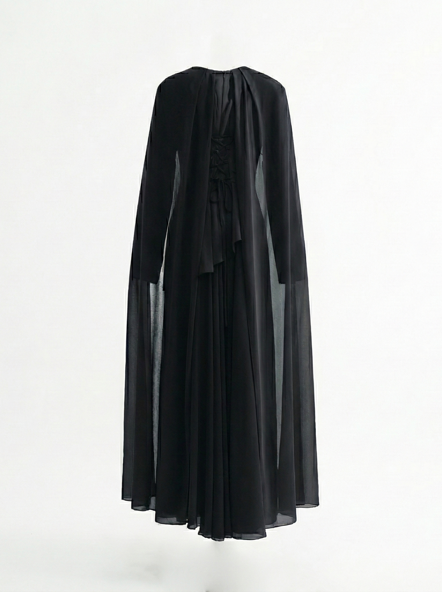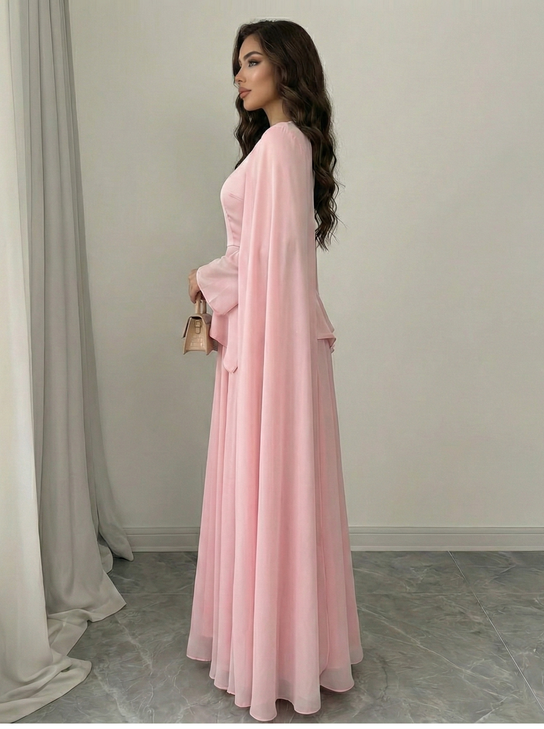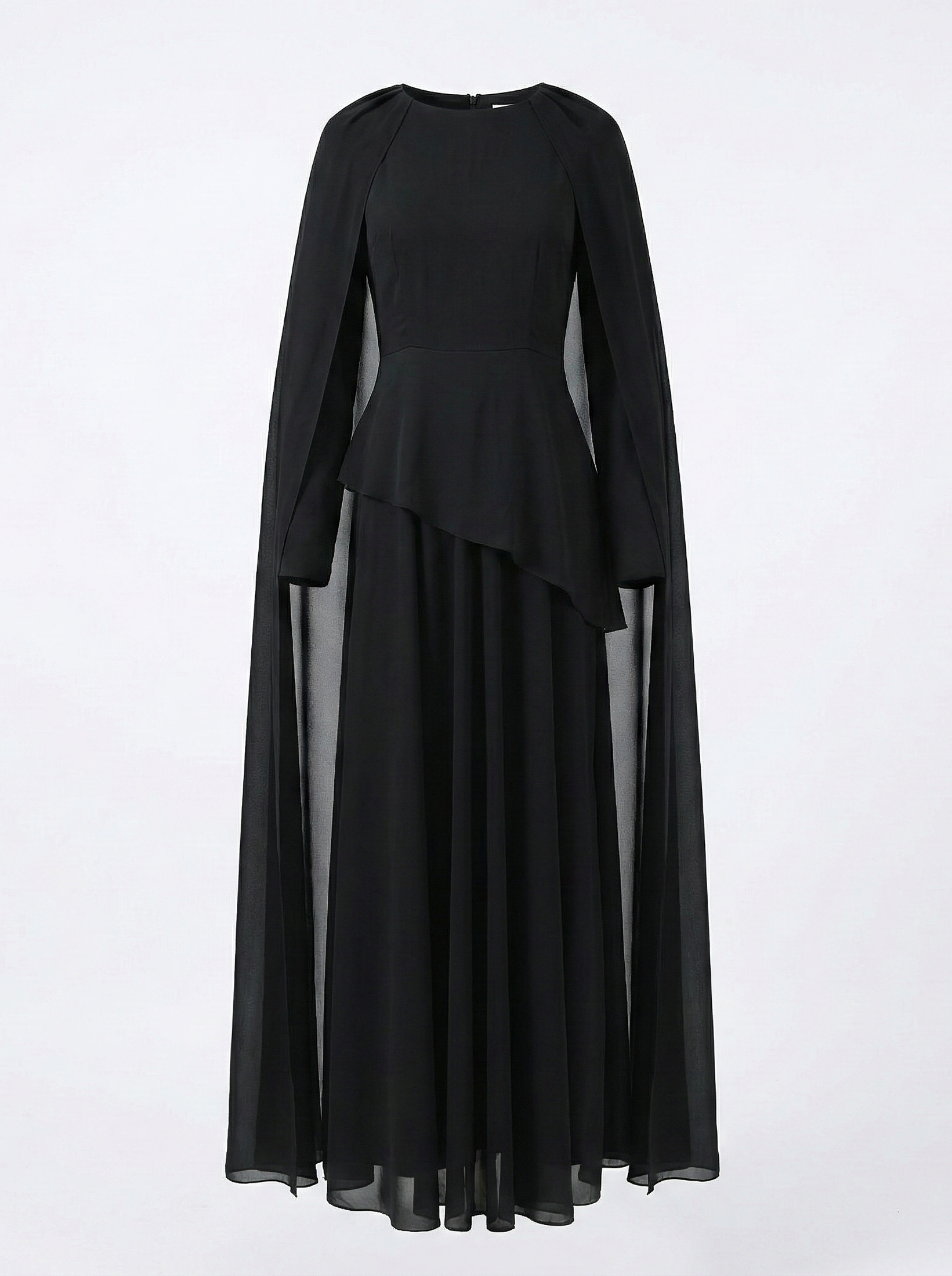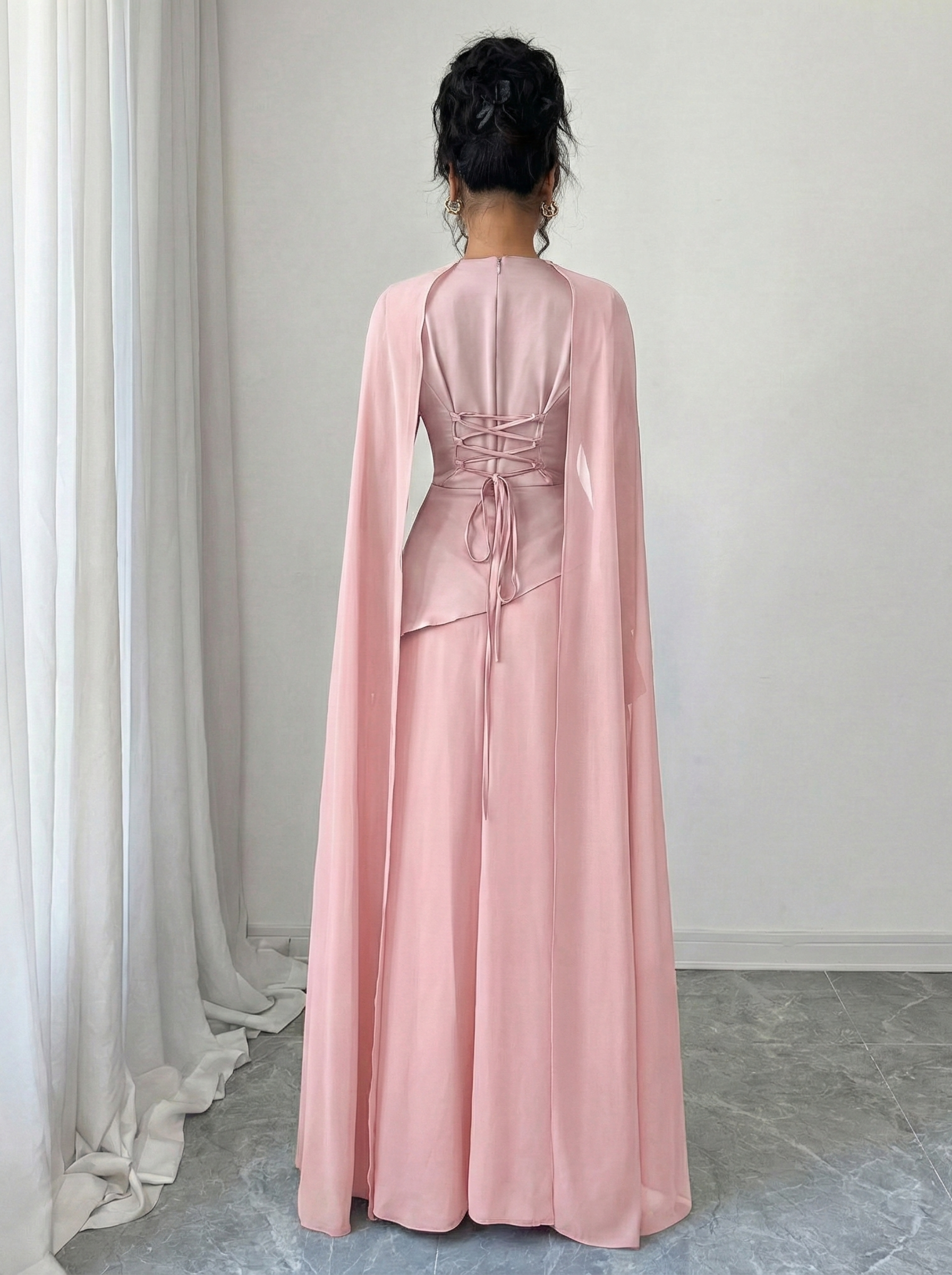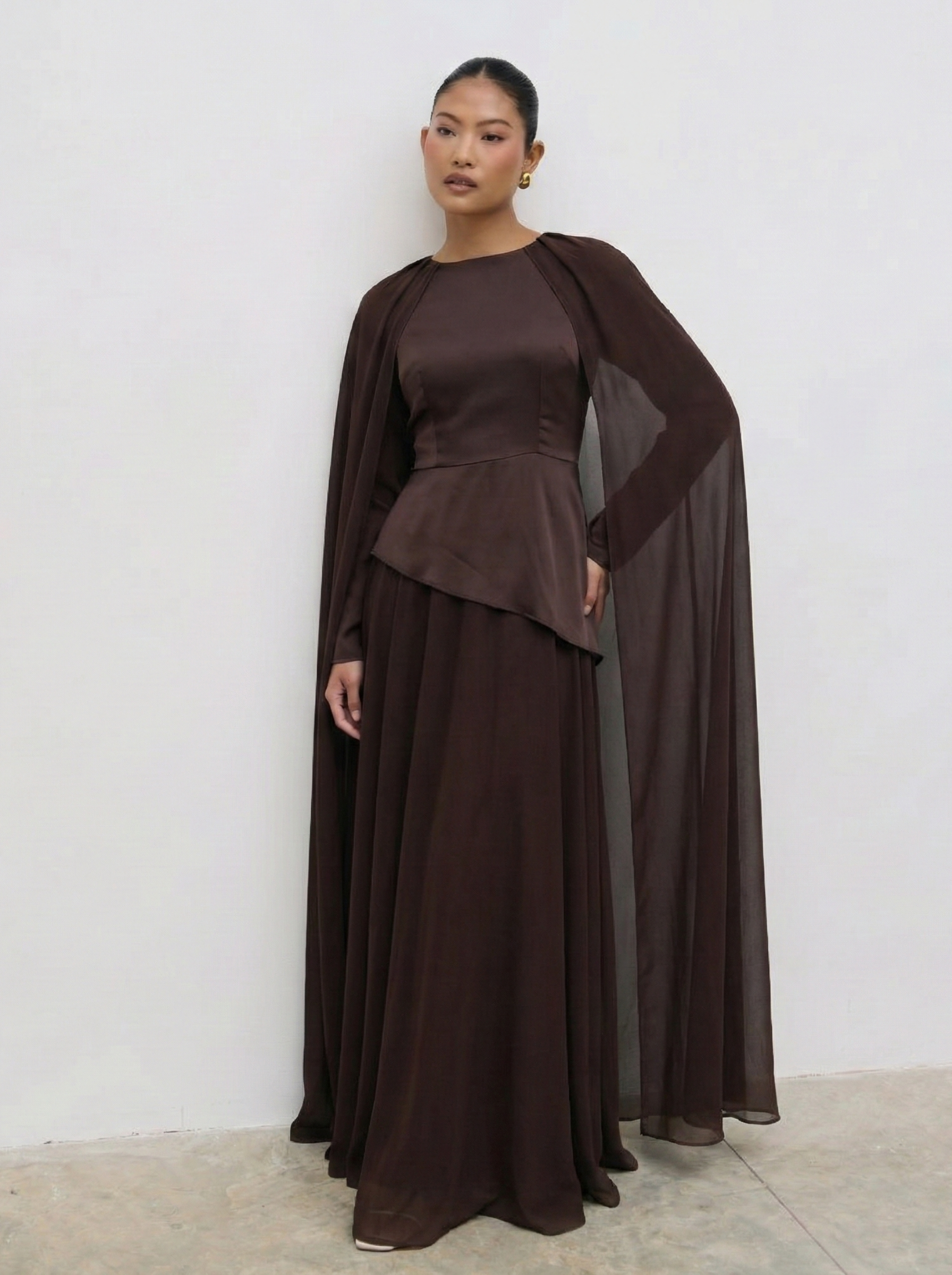 The Diana Dress is a timeless modest gown, featuring a flowing cape overlay on the sides for effortless elegance. Its tailored bodice, soft peplum waist, and adjustable corset back create a flattering, feminine silhouette without compromising coverage. Made from premium crepe chiffon with full lining, it drapes beautifully and moves with grace at every step.