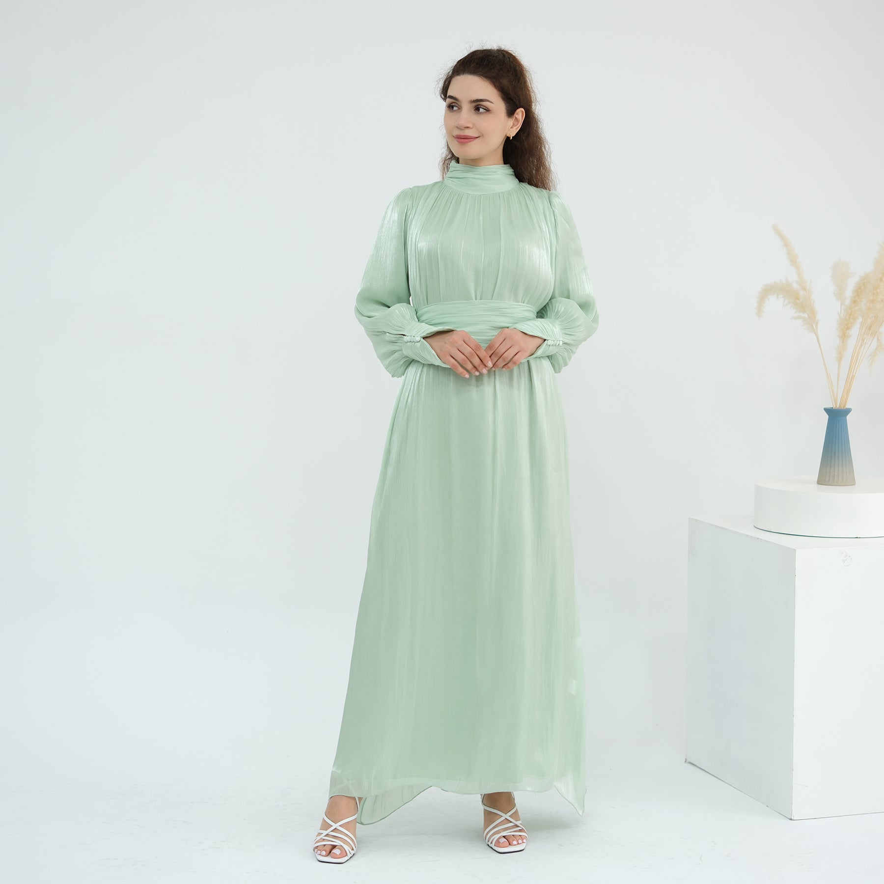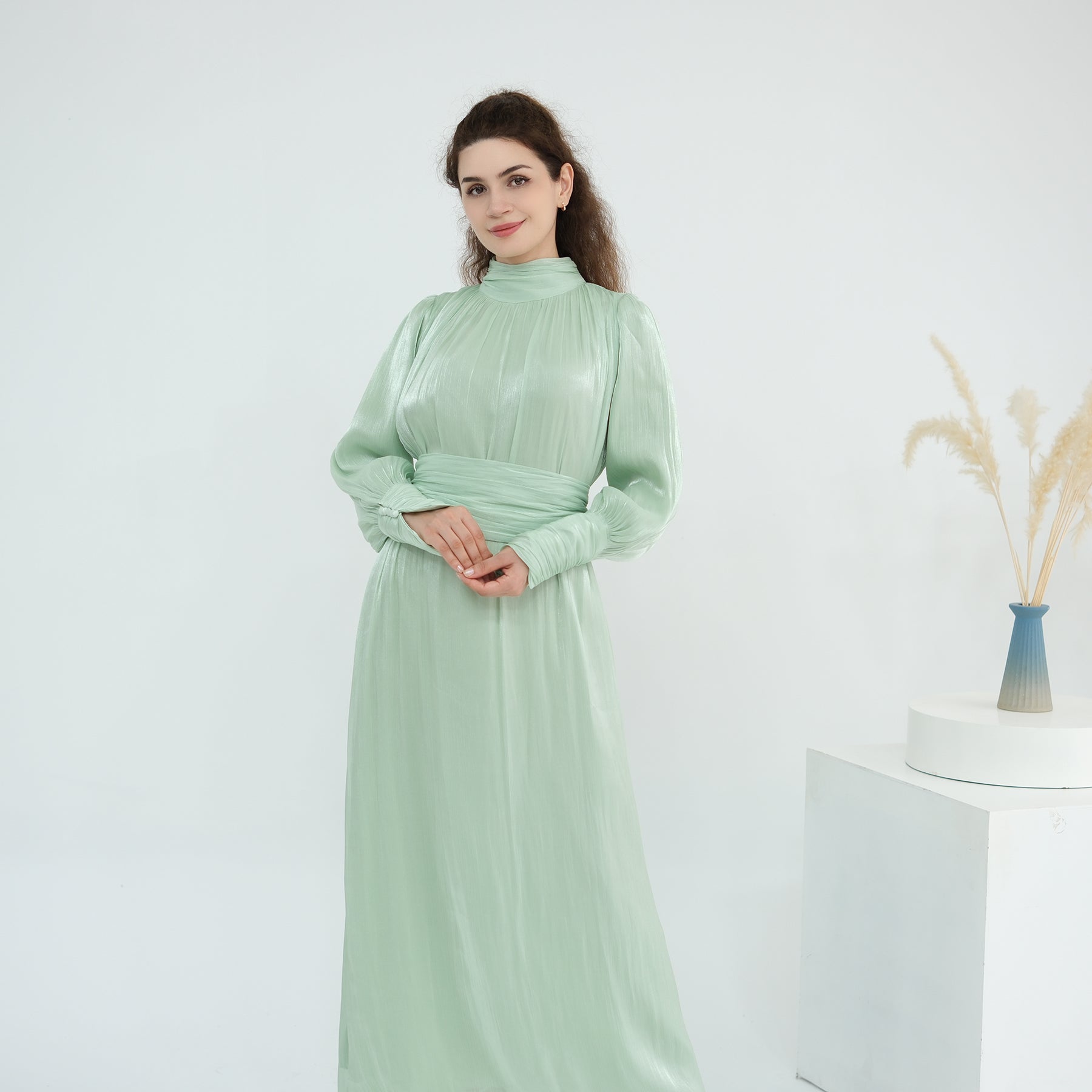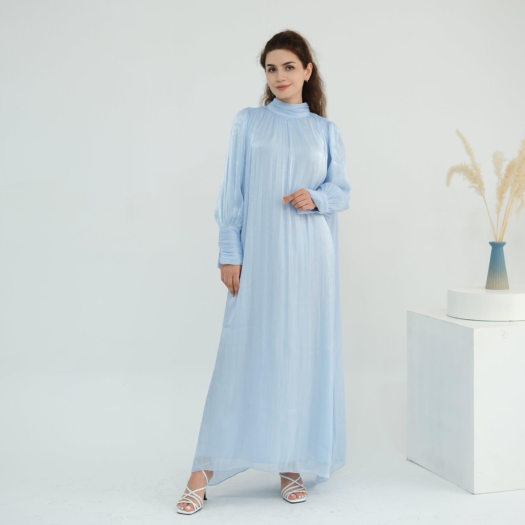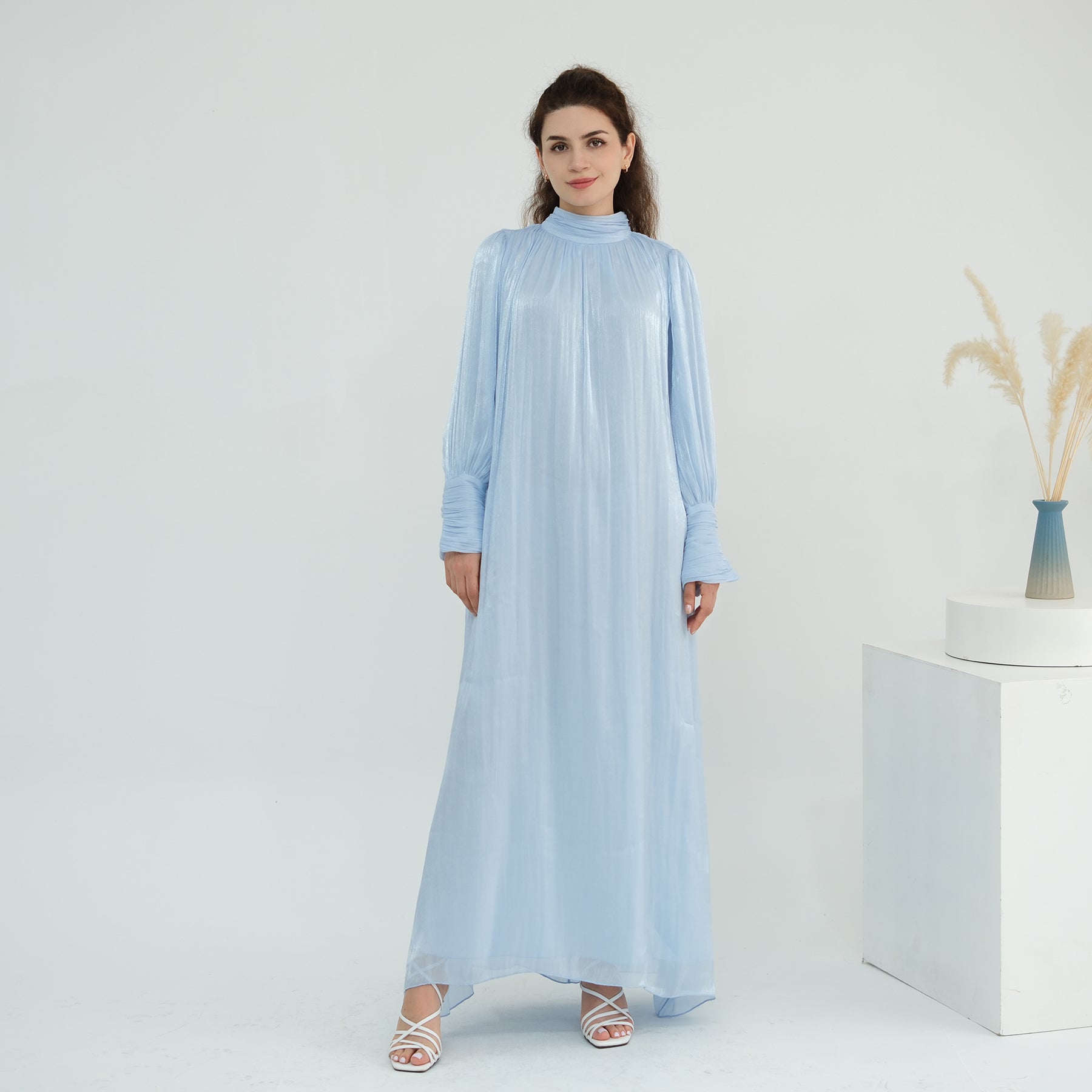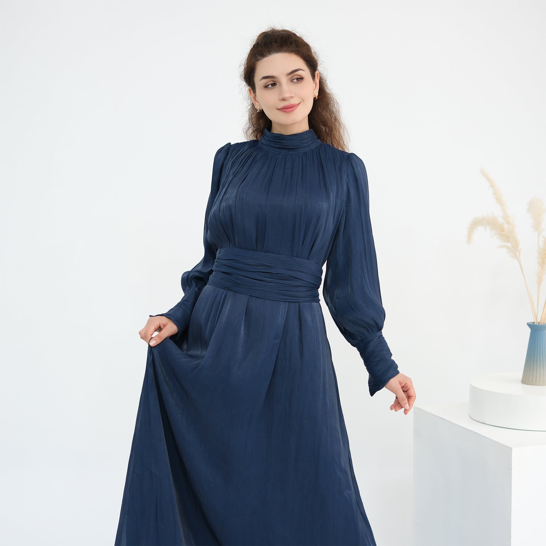 Introducing the Alicia Maxi Dress - a timeless blend of elegance and modesty designed for the modern woman. Crafted from a soft, lightweight shiny polyester fabric, this piece flows effortlessly with every step, giving you that understated glow in natural light. Featuring a flattering high neckline and full-length flared hem, the Alicia dress elongates your silhouette while maintaining all-day comfort.