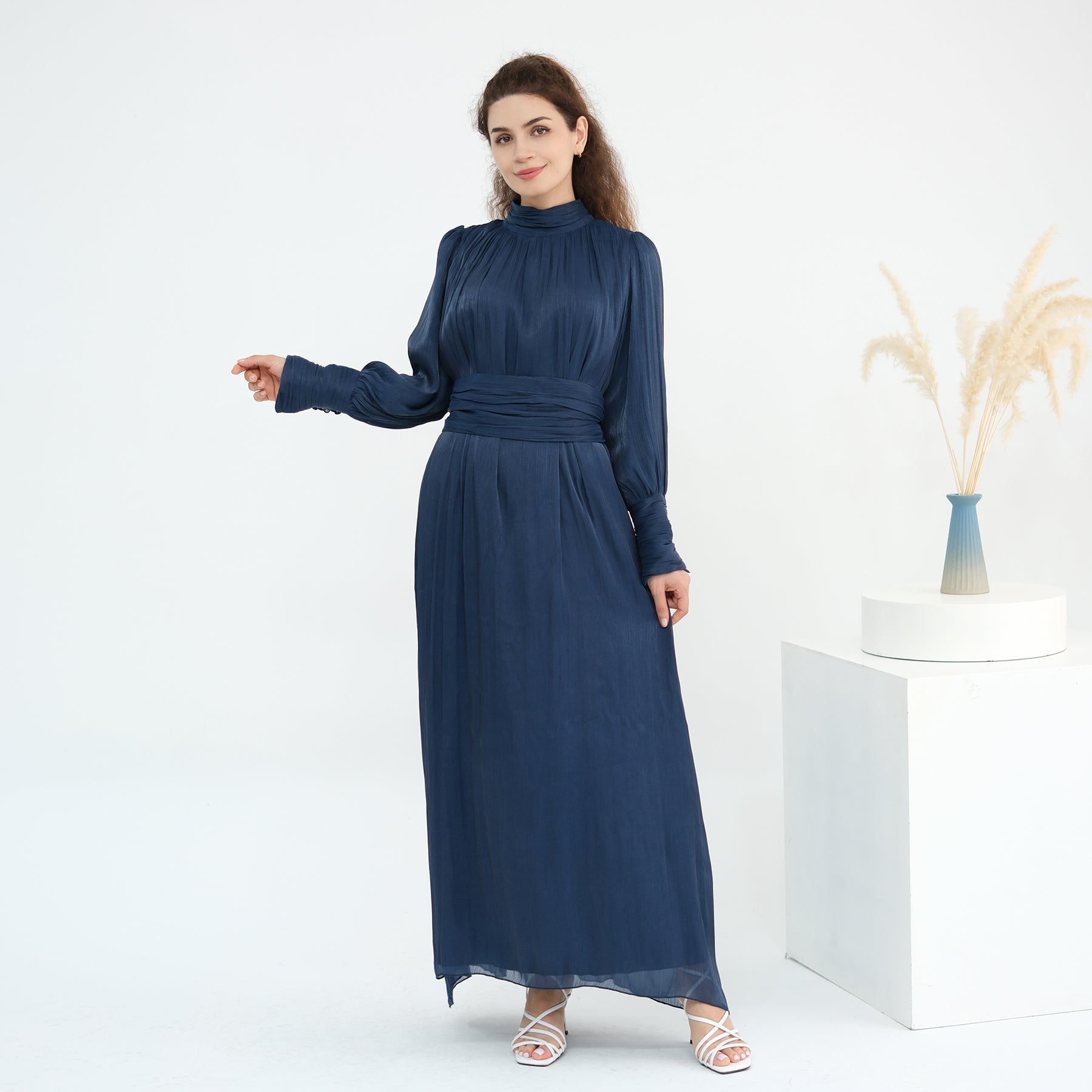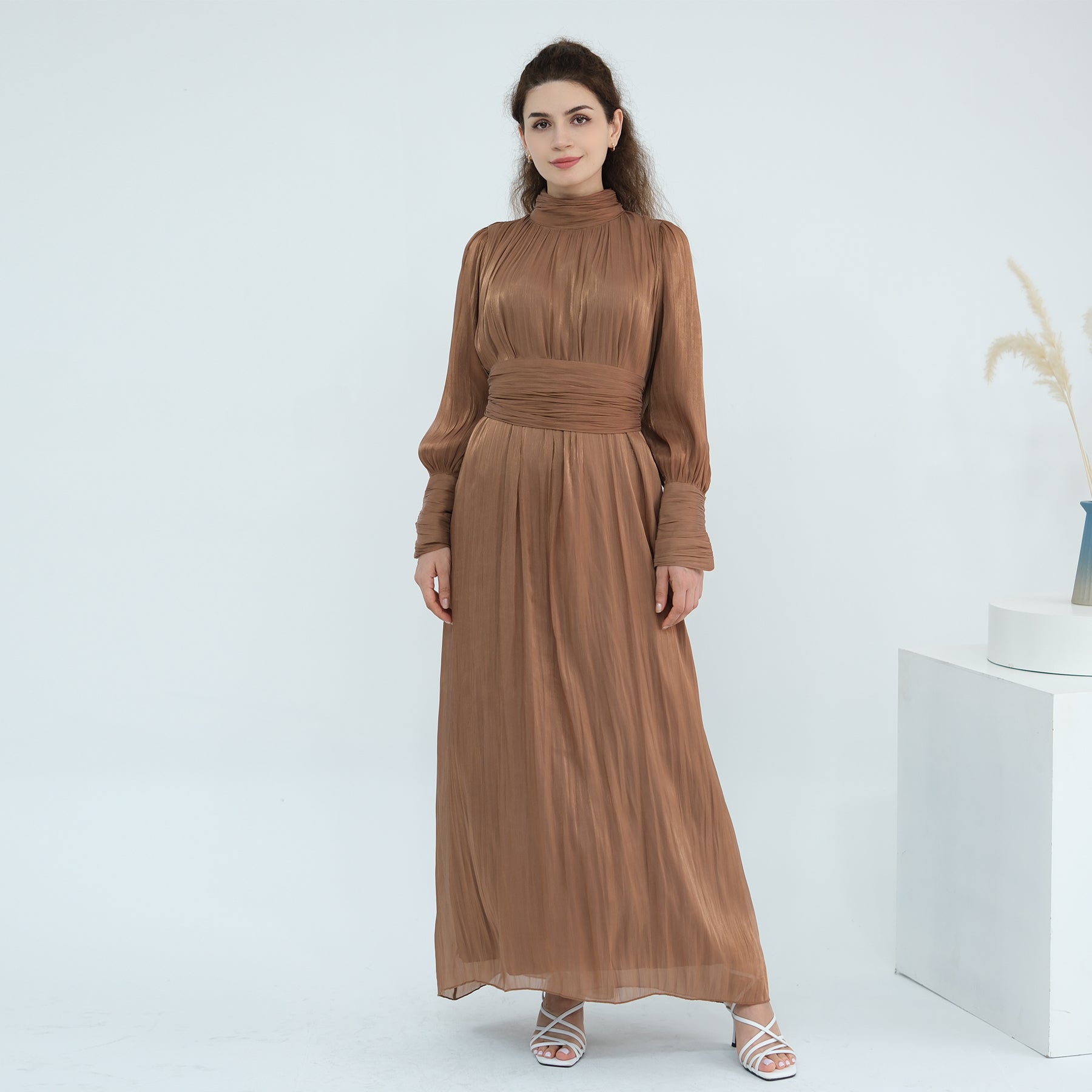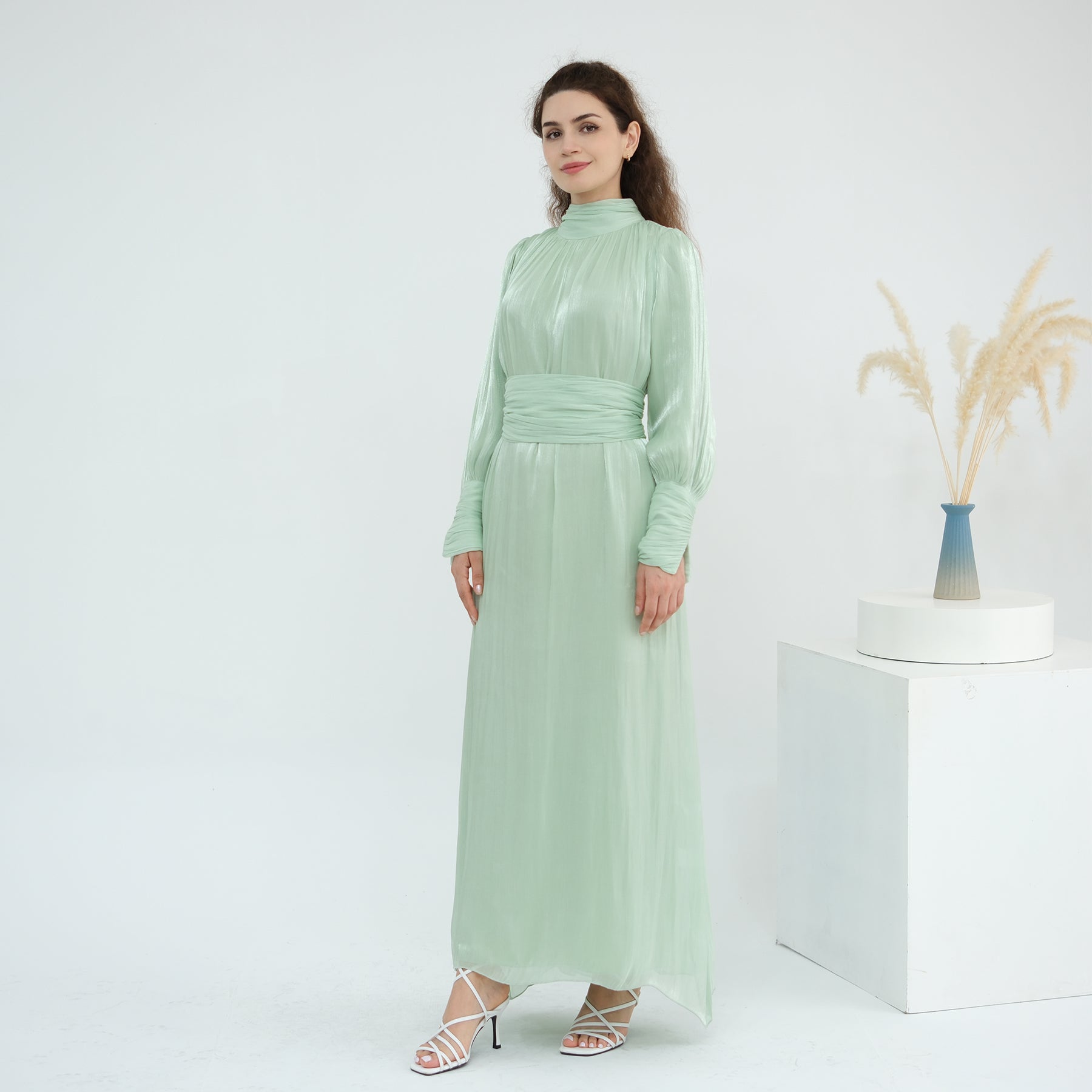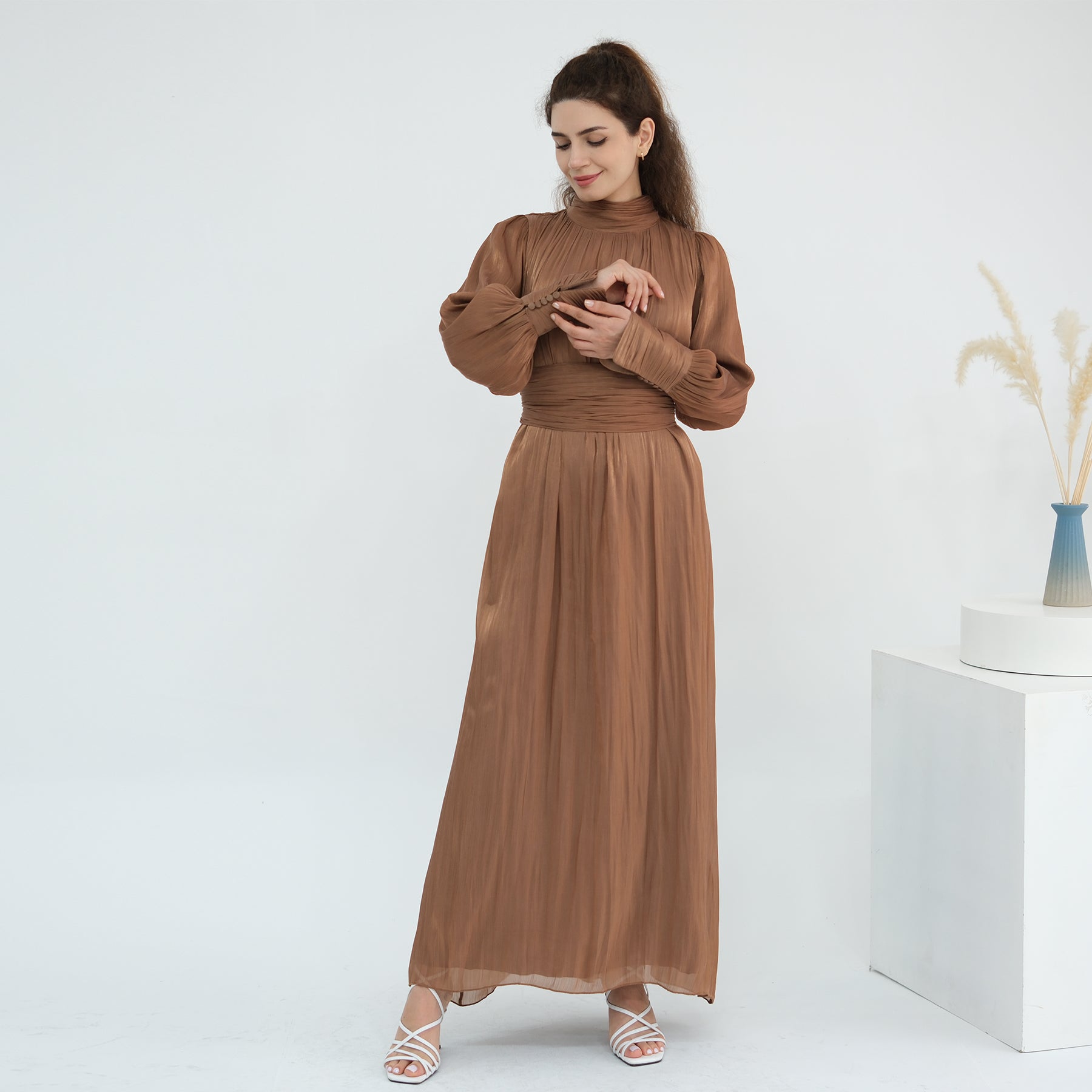 Introducing the Alicia Maxi Dress - a timeless blend of elegance and modesty designed for the modern woman. Crafted from a soft, lightweight shiny polyester fabric, this piece flows effortlessly with every step, giving you that understated glow in natural light. Featuring a flattering high neckline and full-length flared hem, the Alicia dress elongates your silhouette while maintaining all-day comfort.