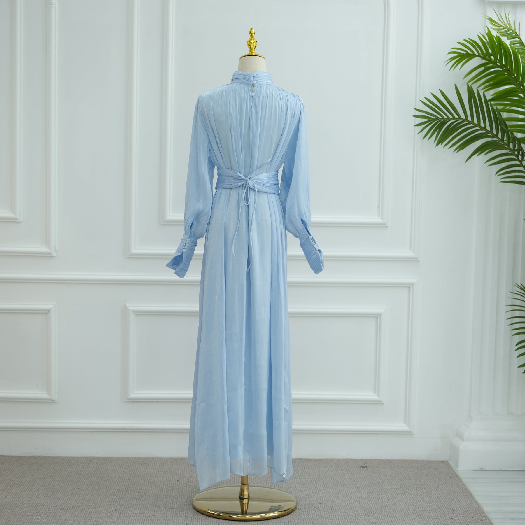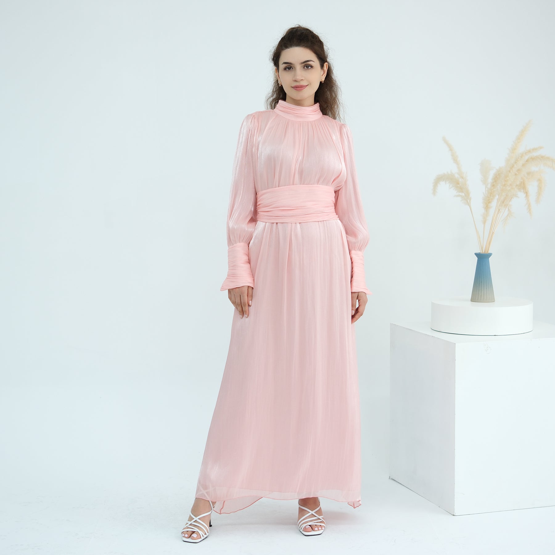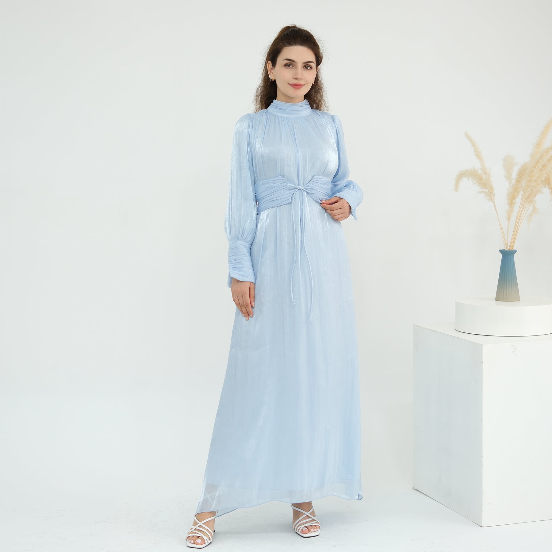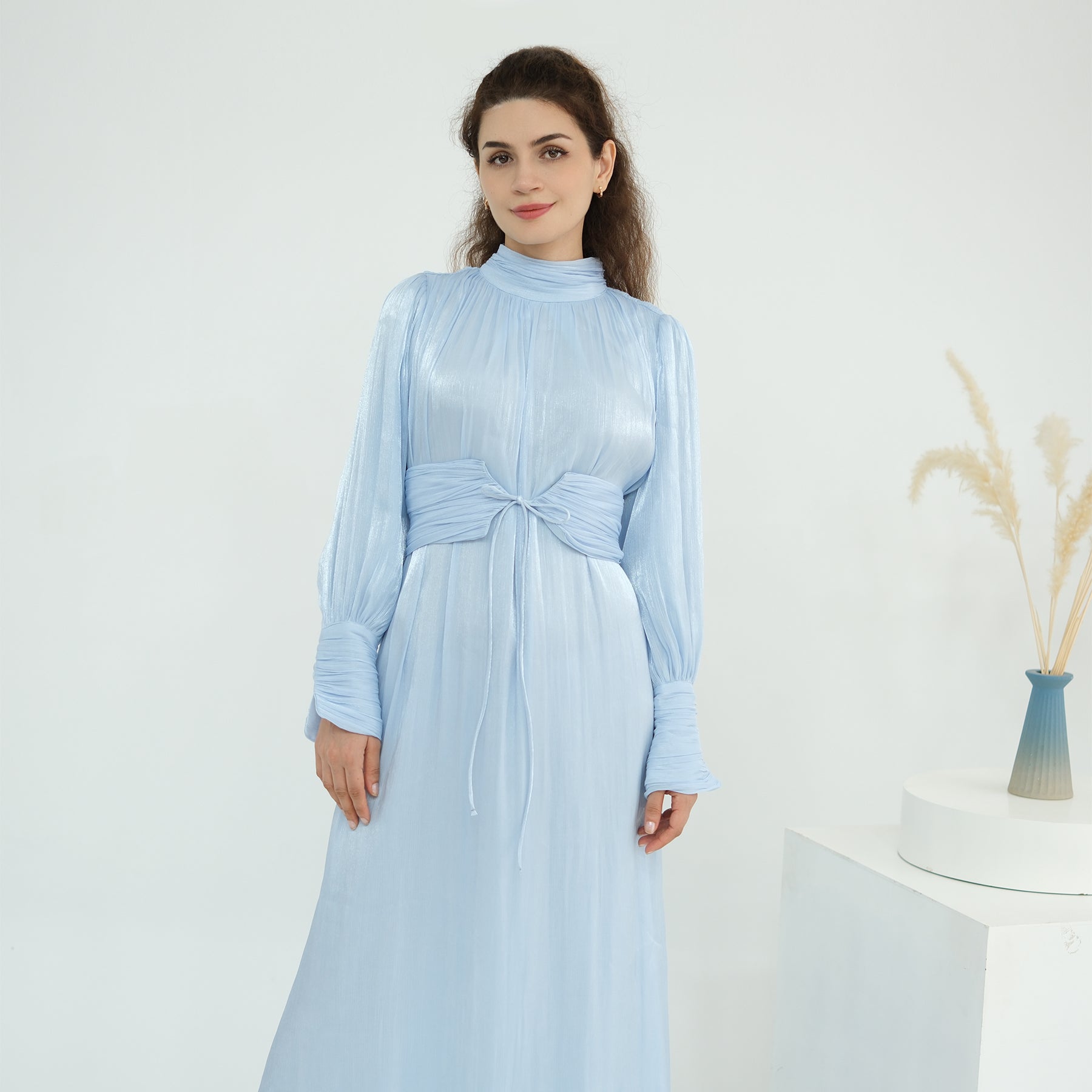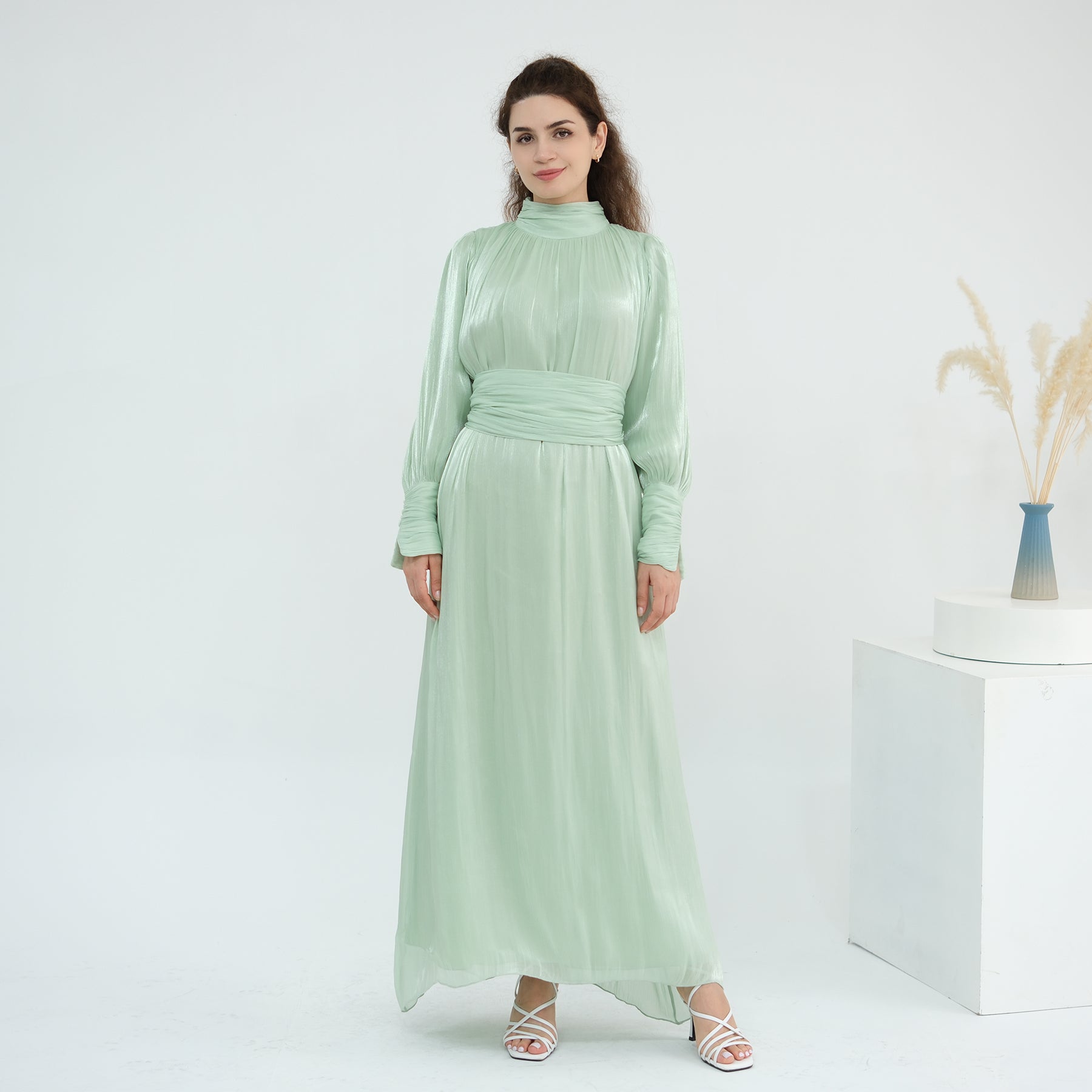 The long sleeves are gently gathered and cuffed, creating a subtle statement without overwhelming your look. Fully lined for coverage, this dress is ideal for formal gatherings, Eid celebrations, or balmy summer evenings. The cinched waist detail enhances your shape while offering breathable ease for warm-weather wear.