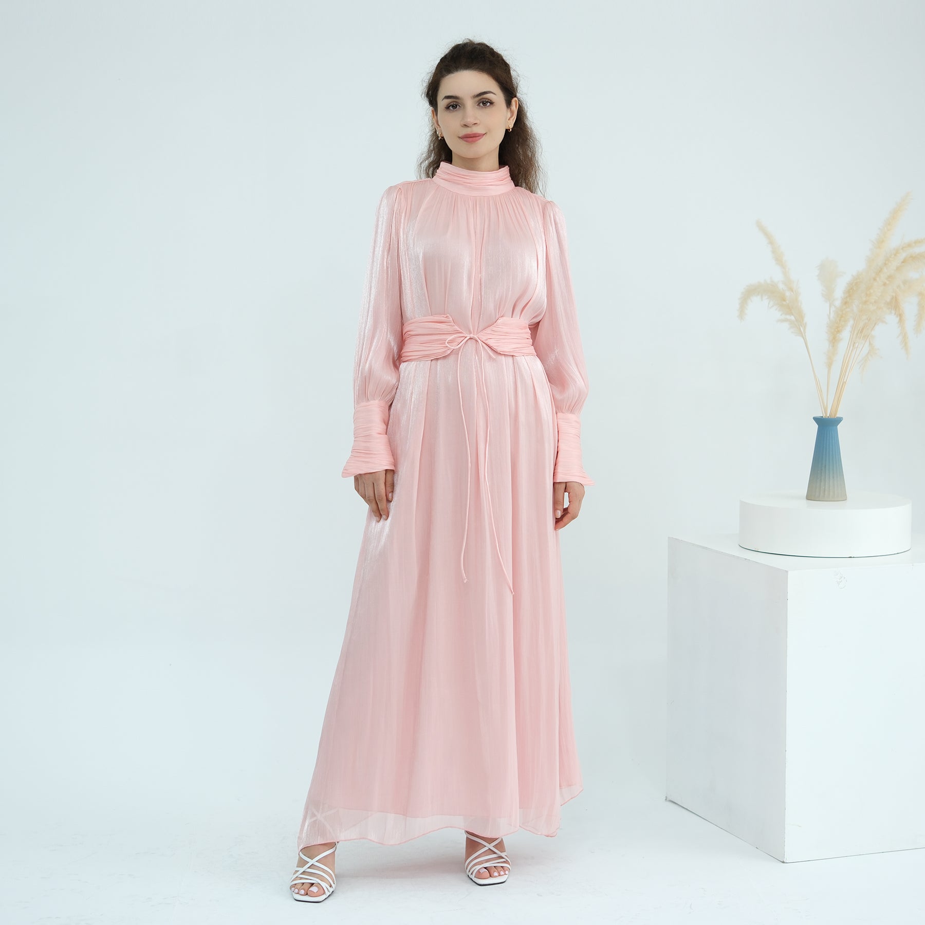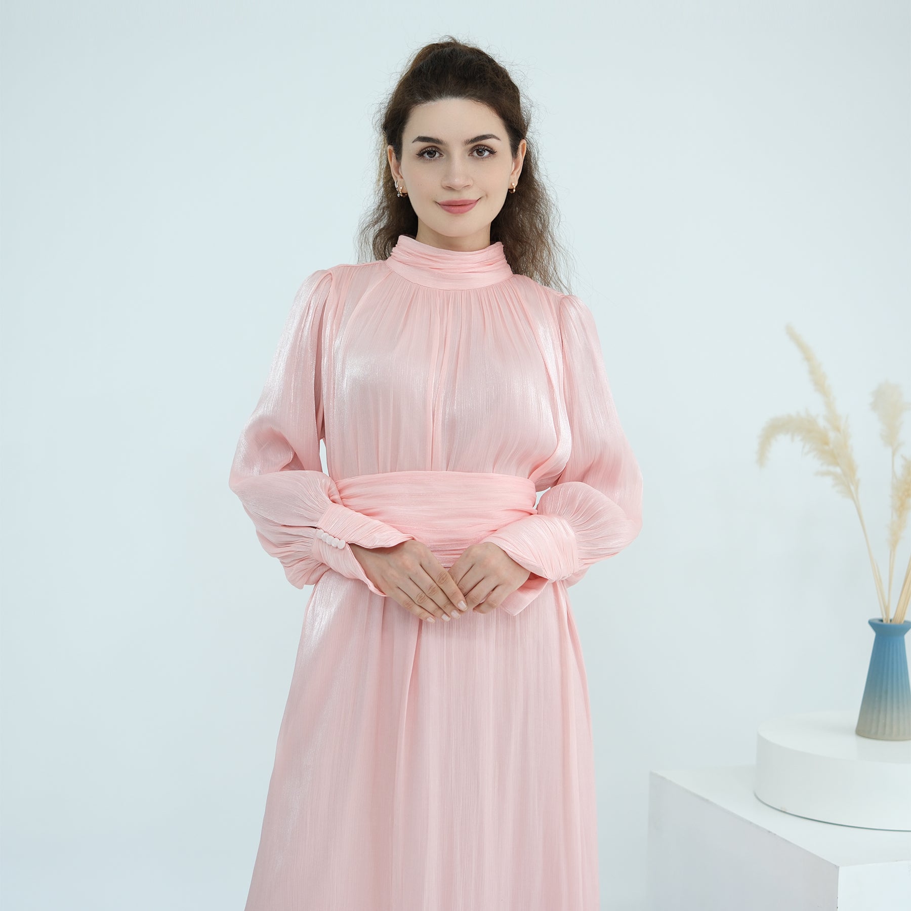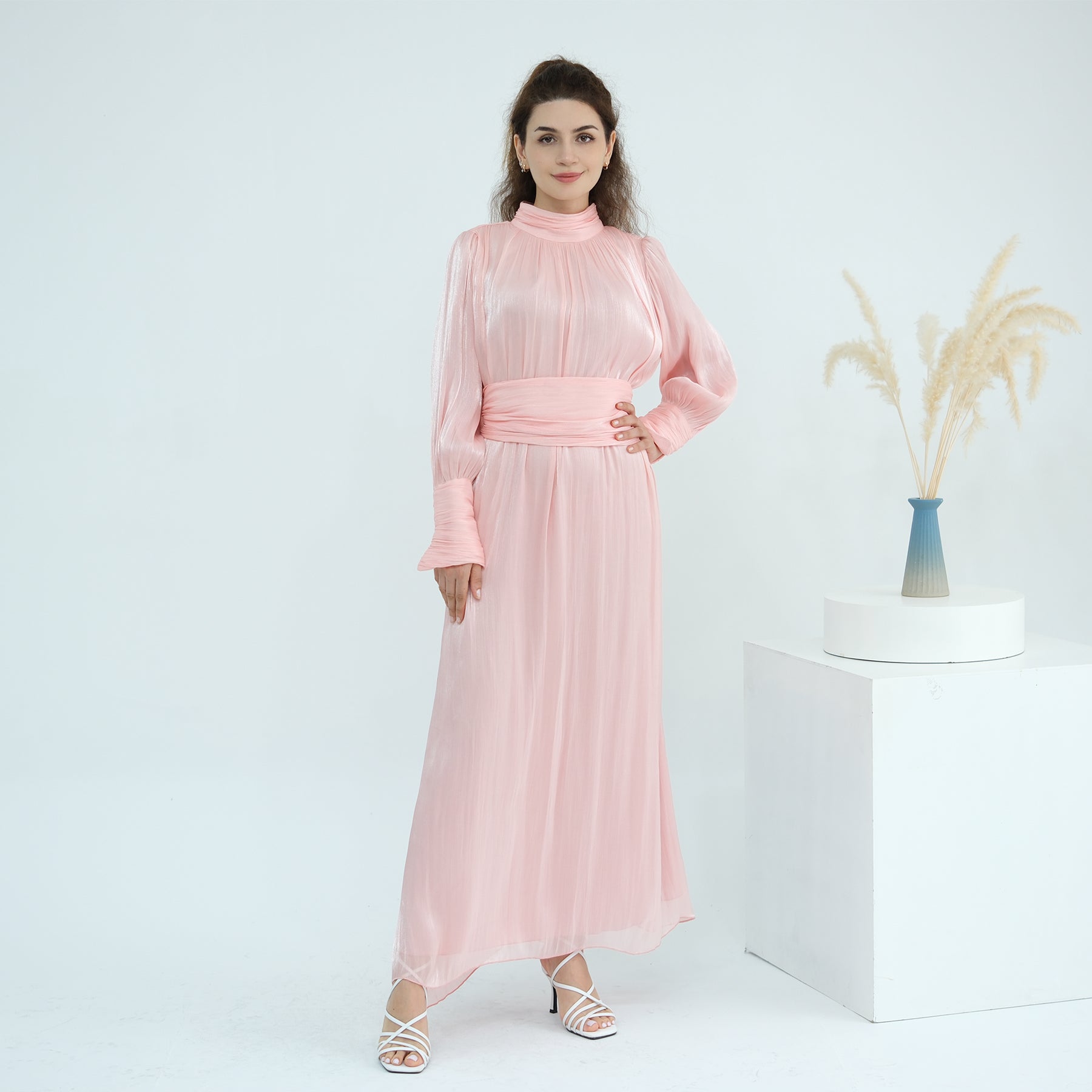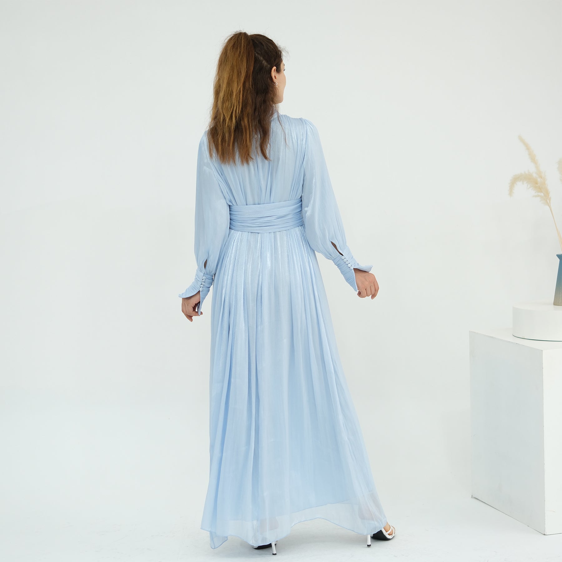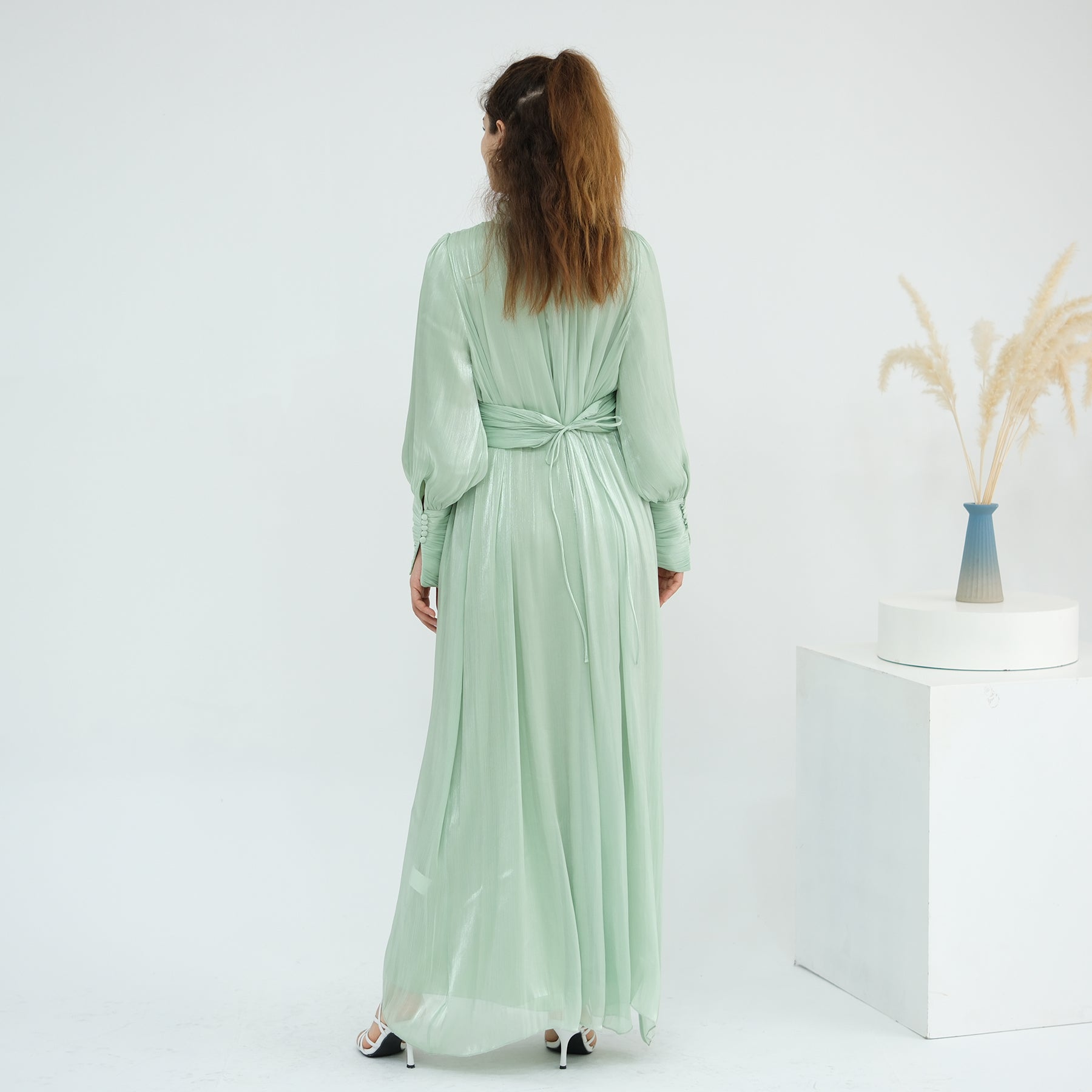The long sleeves are gently gathered and cuffed, creating a subtle statement without overwhelming your look. Fully lined for coverage, this dress is ideal for formal gatherings, Eid celebrations, or balmy summer evenings. The cinched waist detail enhances your shape while offering breathable ease for warm-weather wear.