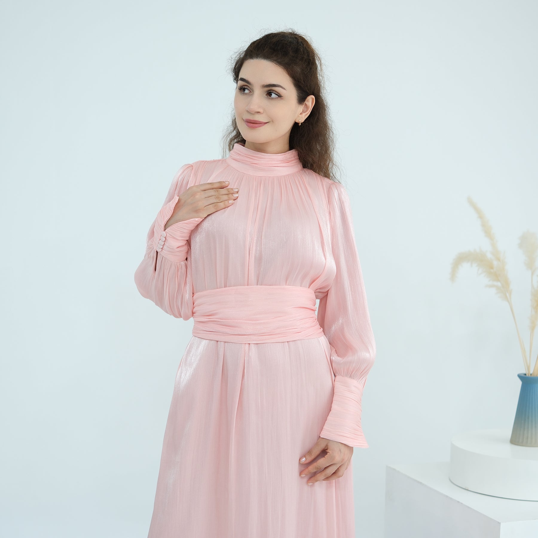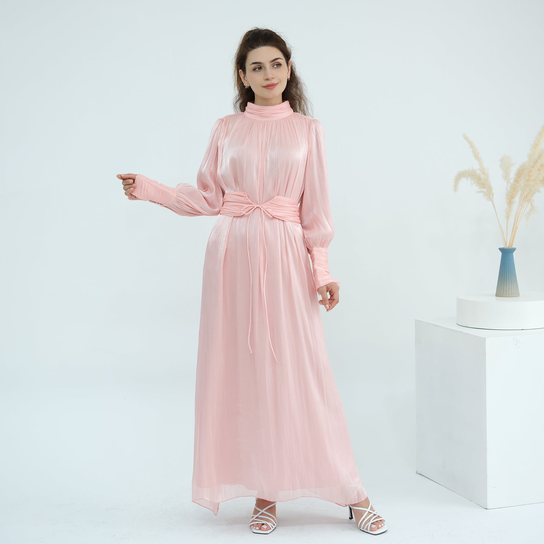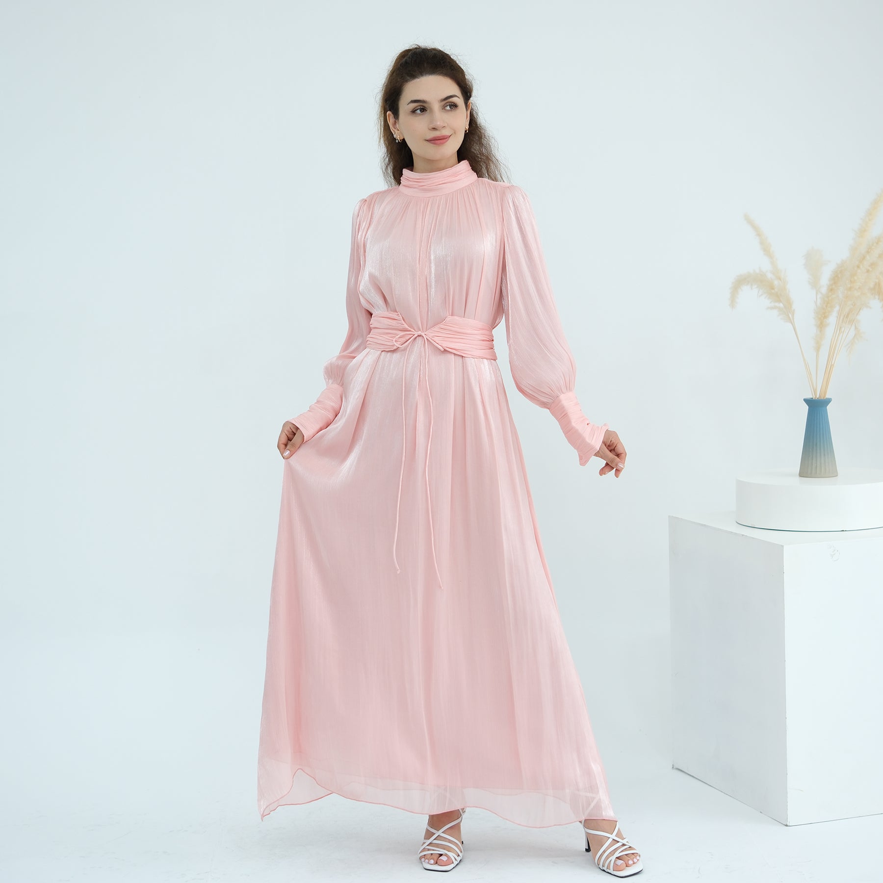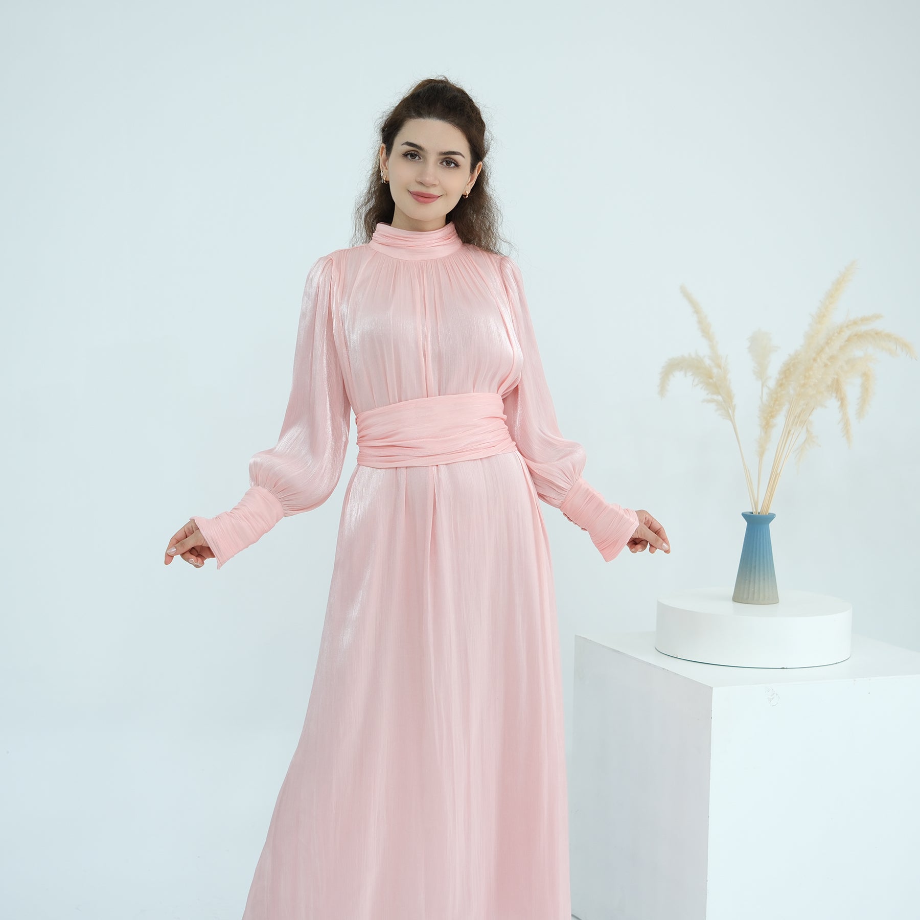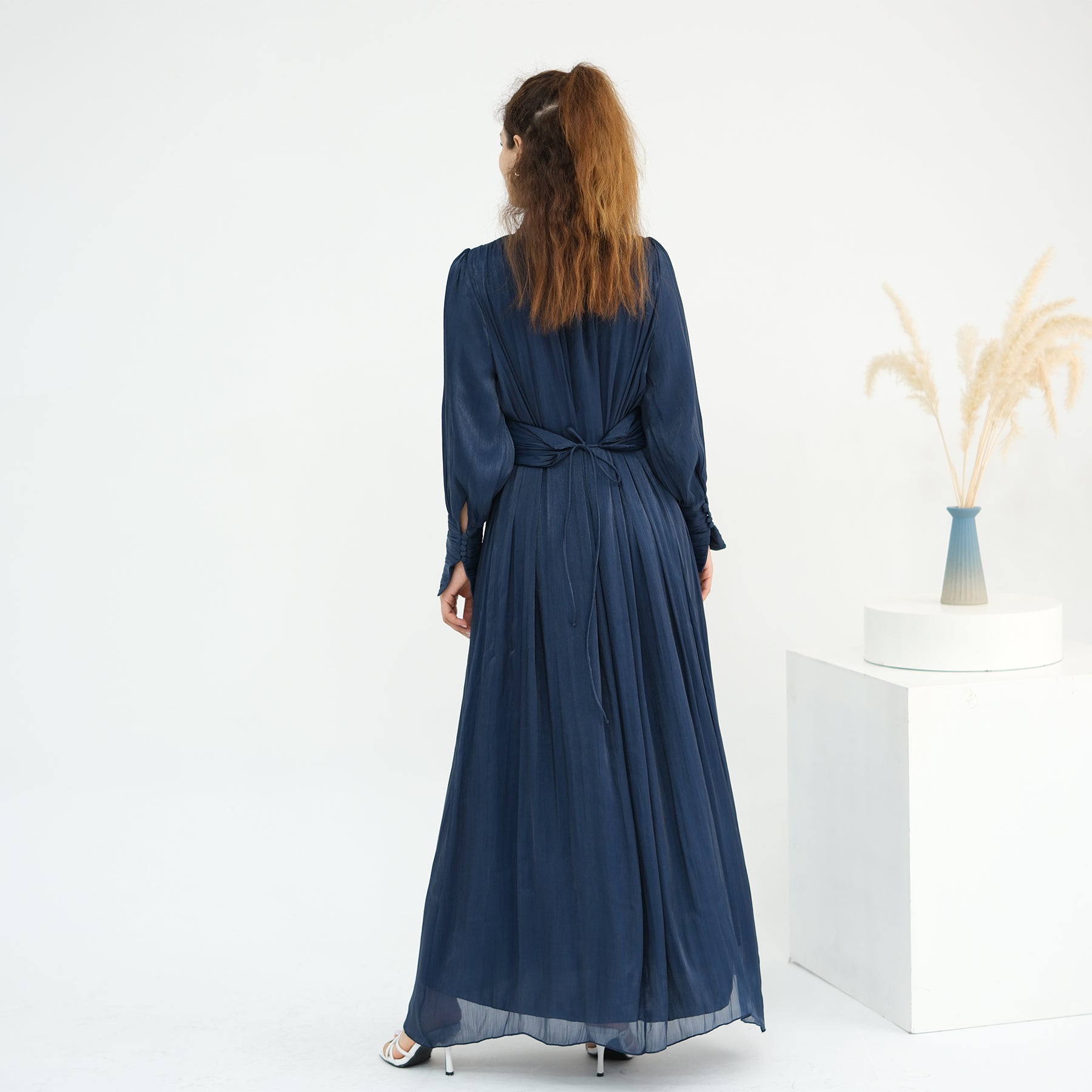 The long sleeves are gently gathered and cuffed, creating a subtle statement without overwhelming your look. Fully lined for coverage, this dress is ideal for formal gatherings, Eid celebrations, or balmy summer evenings. The cinched waist detail enhances your shape while offering breathable ease for warm-weather wear.