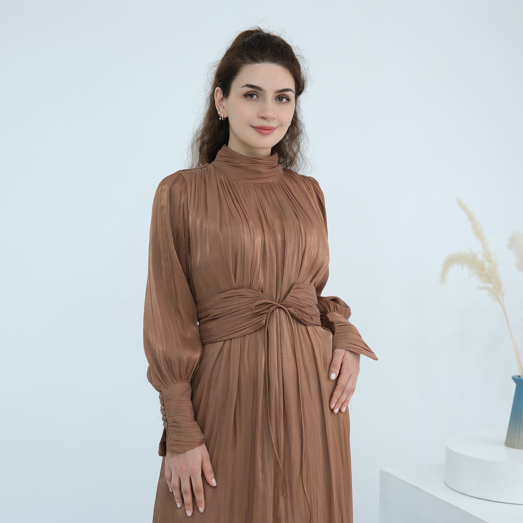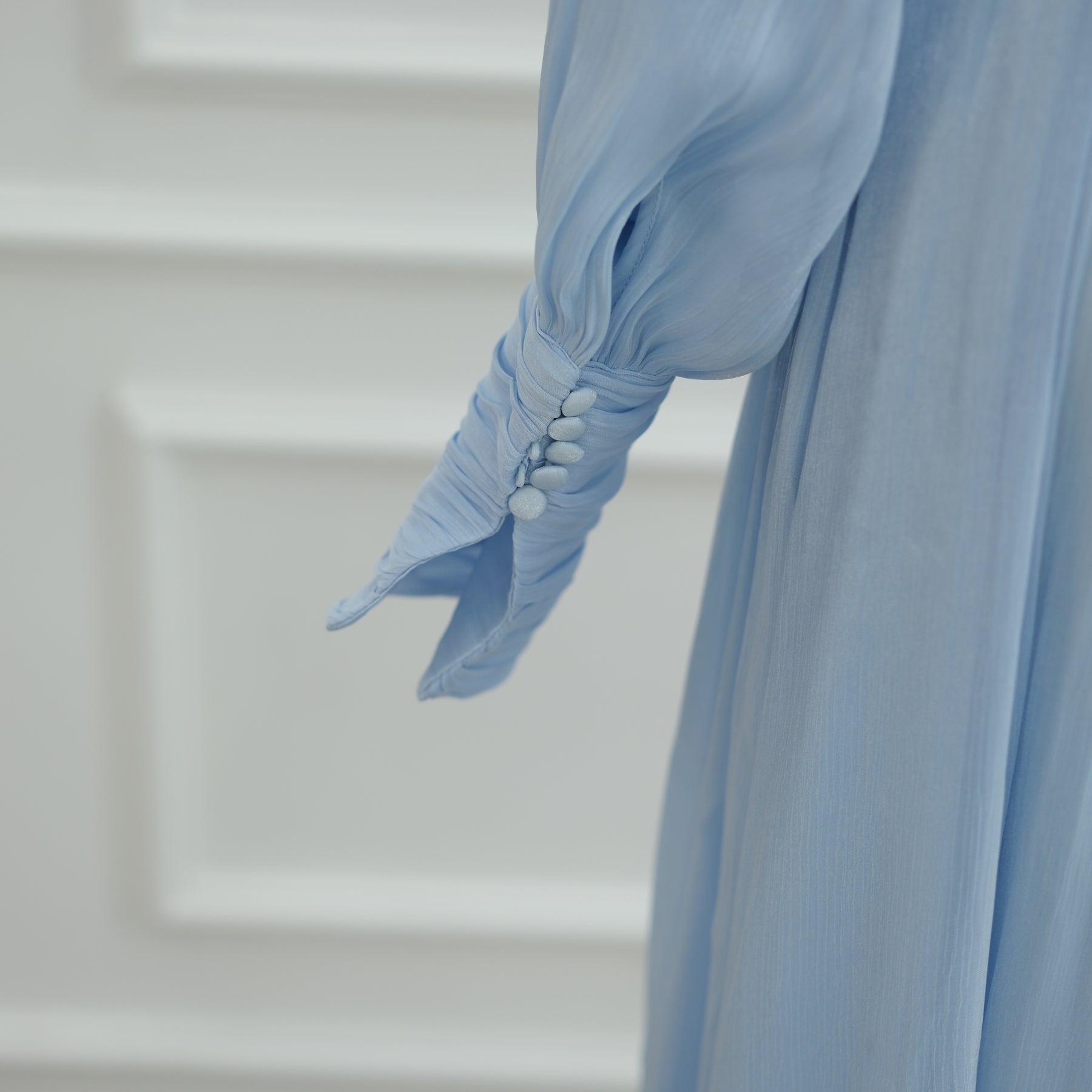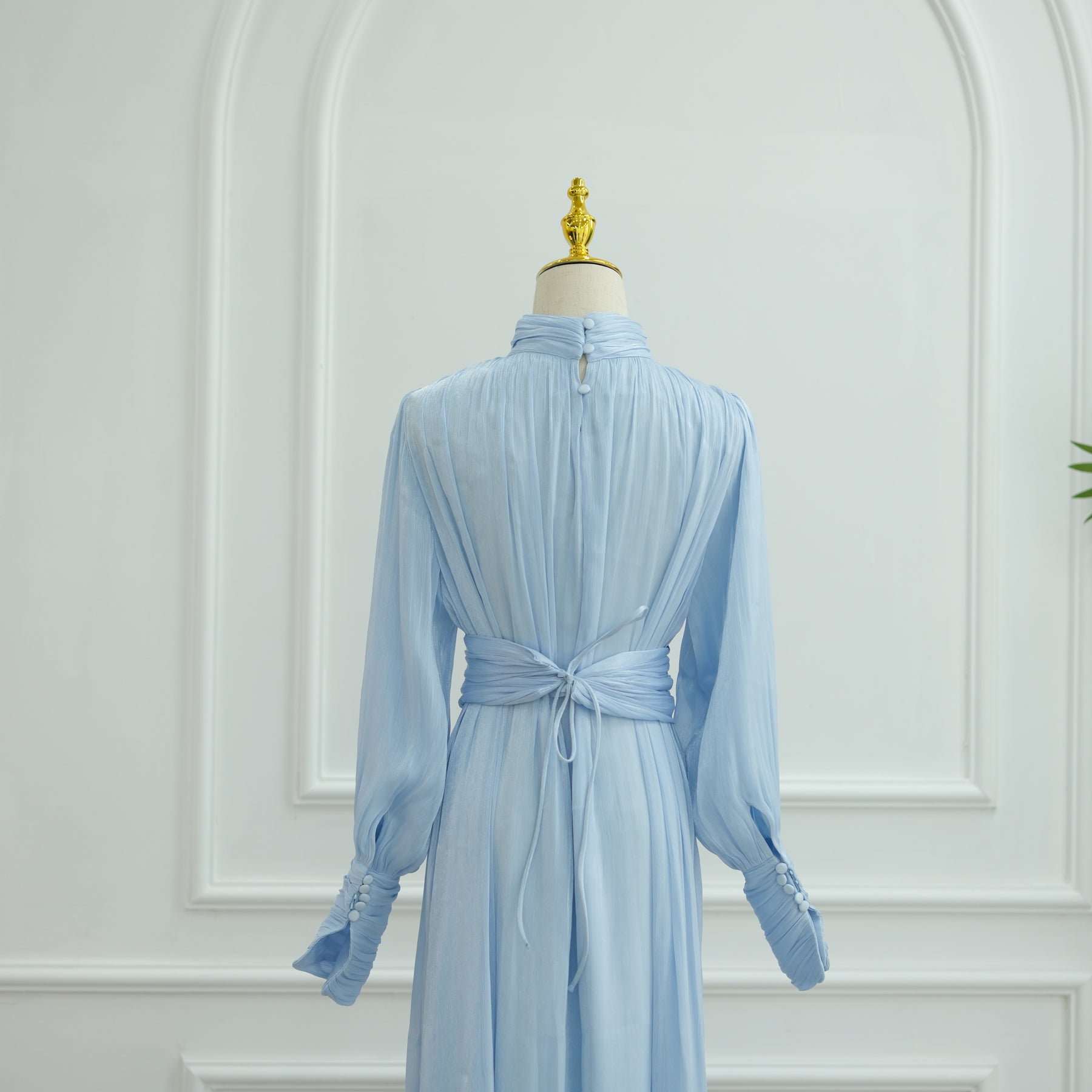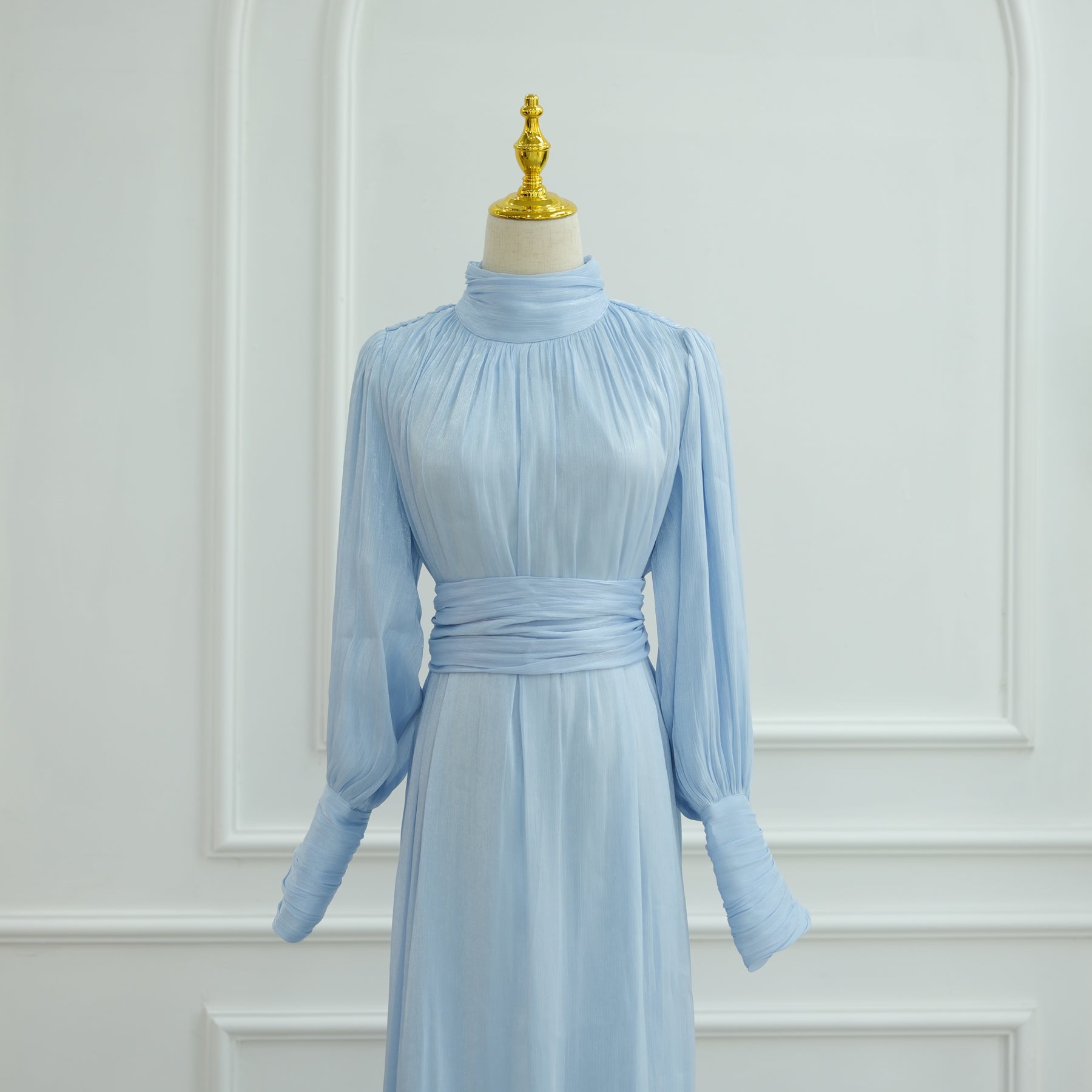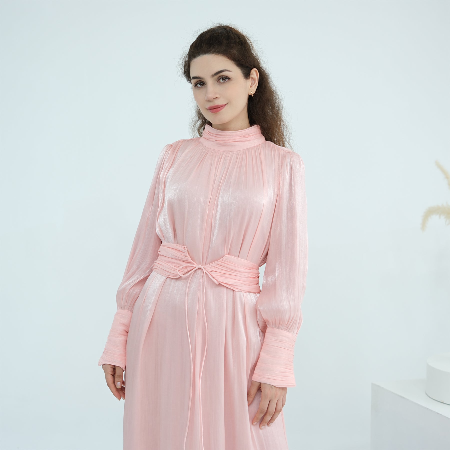 The long sleeves are gently gathered and cuffed, creating a subtle statement without overwhelming your look. Fully lined for coverage, this dress is ideal for formal gatherings, Eid celebrations, or balmy summer evenings. The cinched waist detail enhances your shape while offering breathable ease for warm-weather wear.