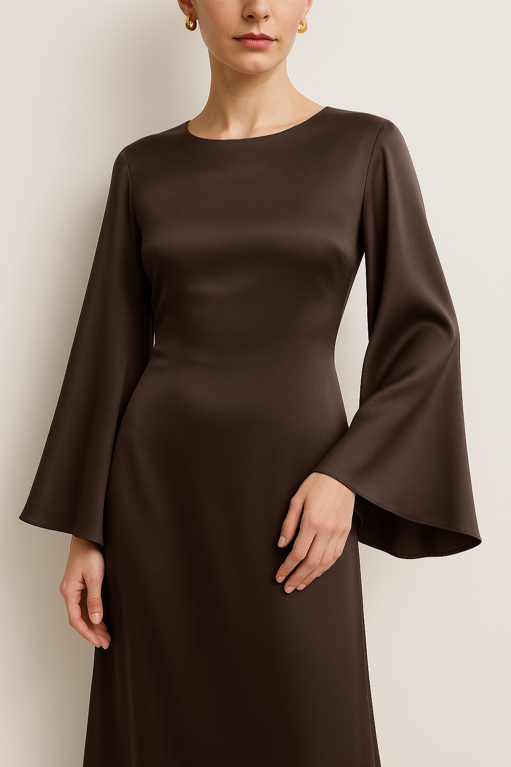 Elevate your wardrobe with this timeless satin gown modest dress. Designed with dramatic bell sleeves and a clean, minimal silhouette, this full-length dress moves effortlessly from formal events to elegant evenings.