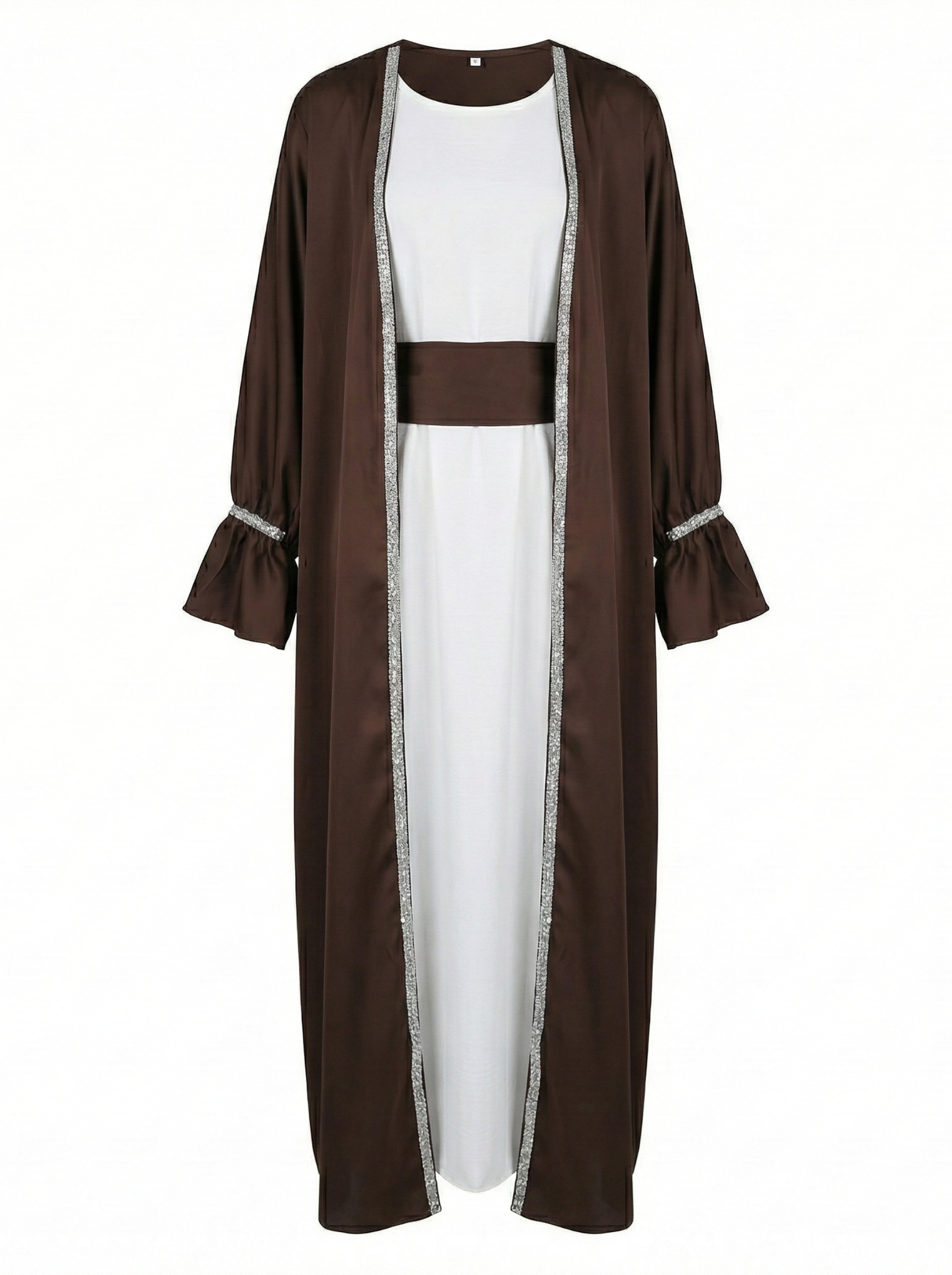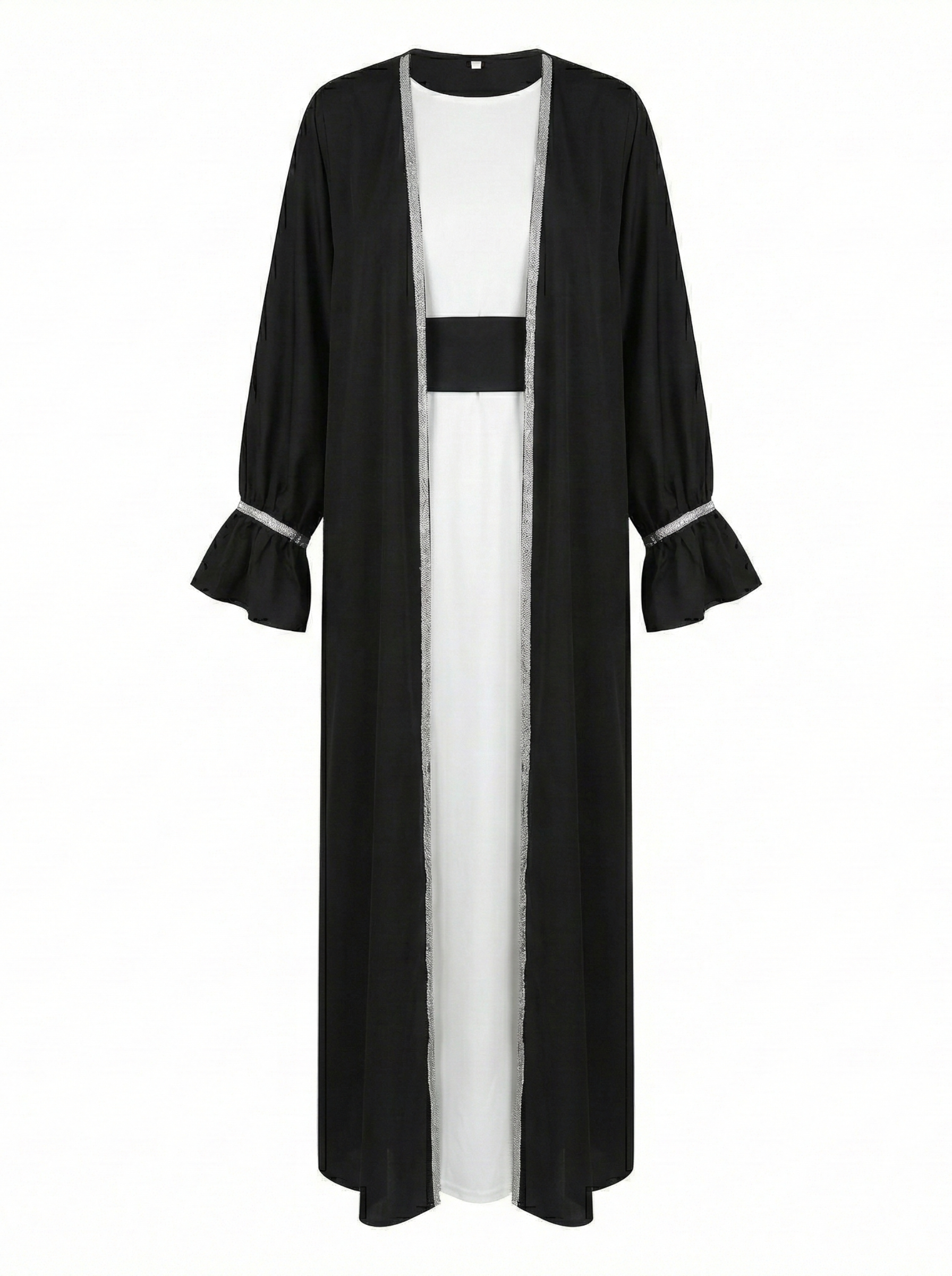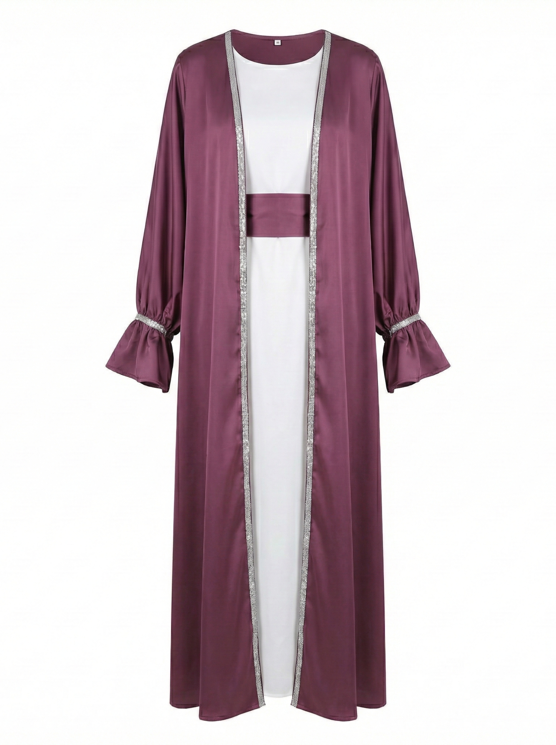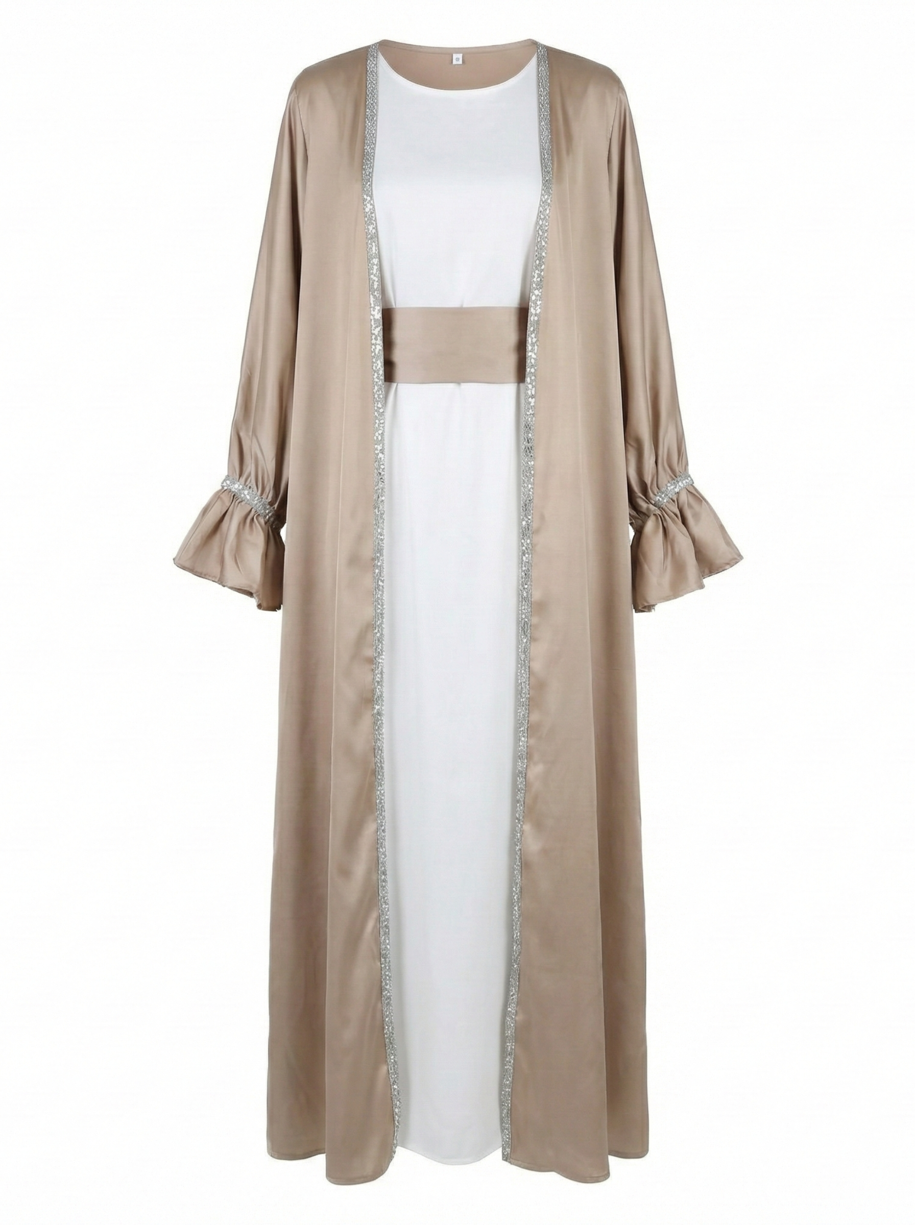The set includes an open abaya, a long-sleeve inner dress, a matching belt, creating a cohesive and polished look. It also has pockets for easy wear and functionality