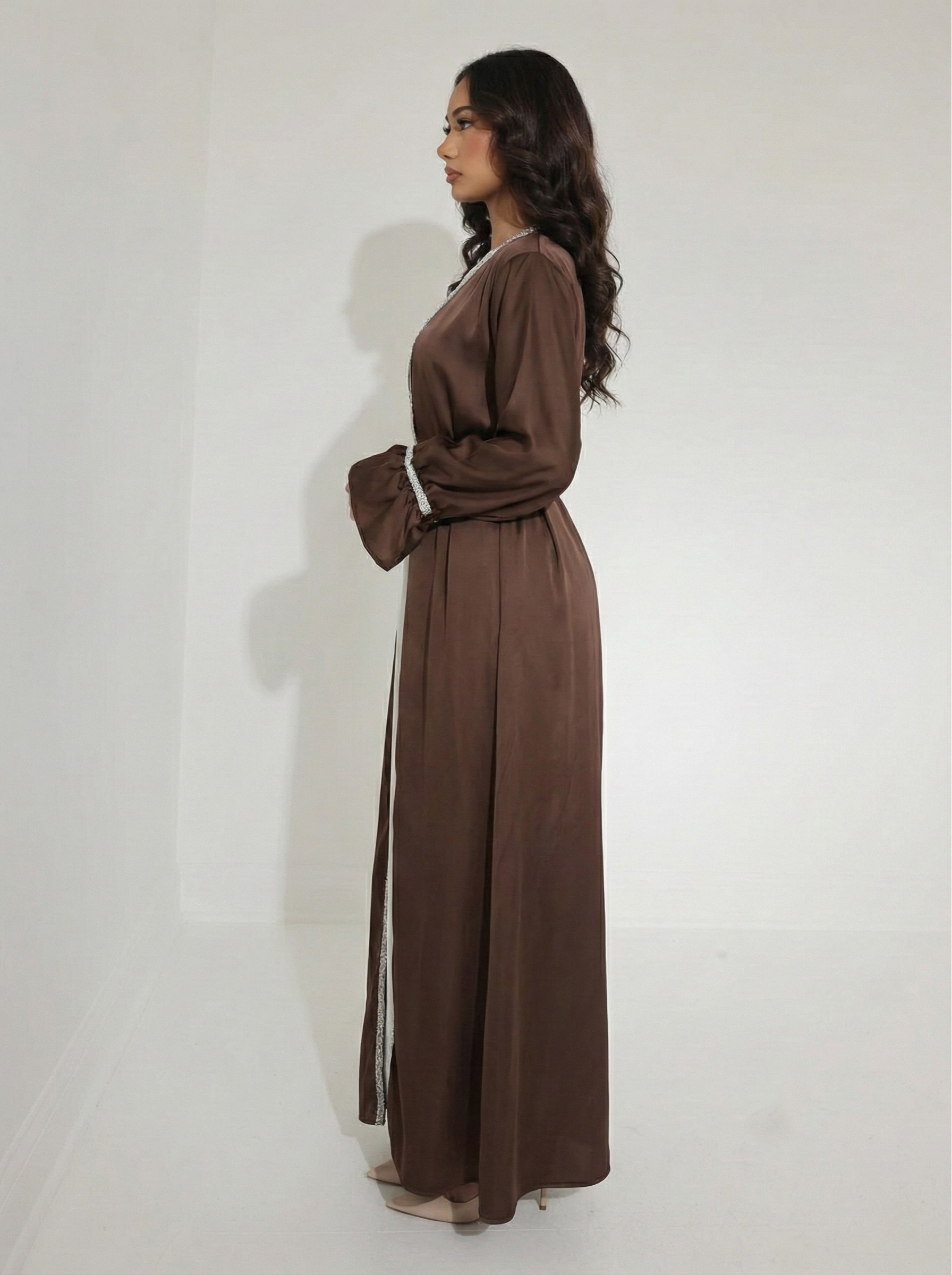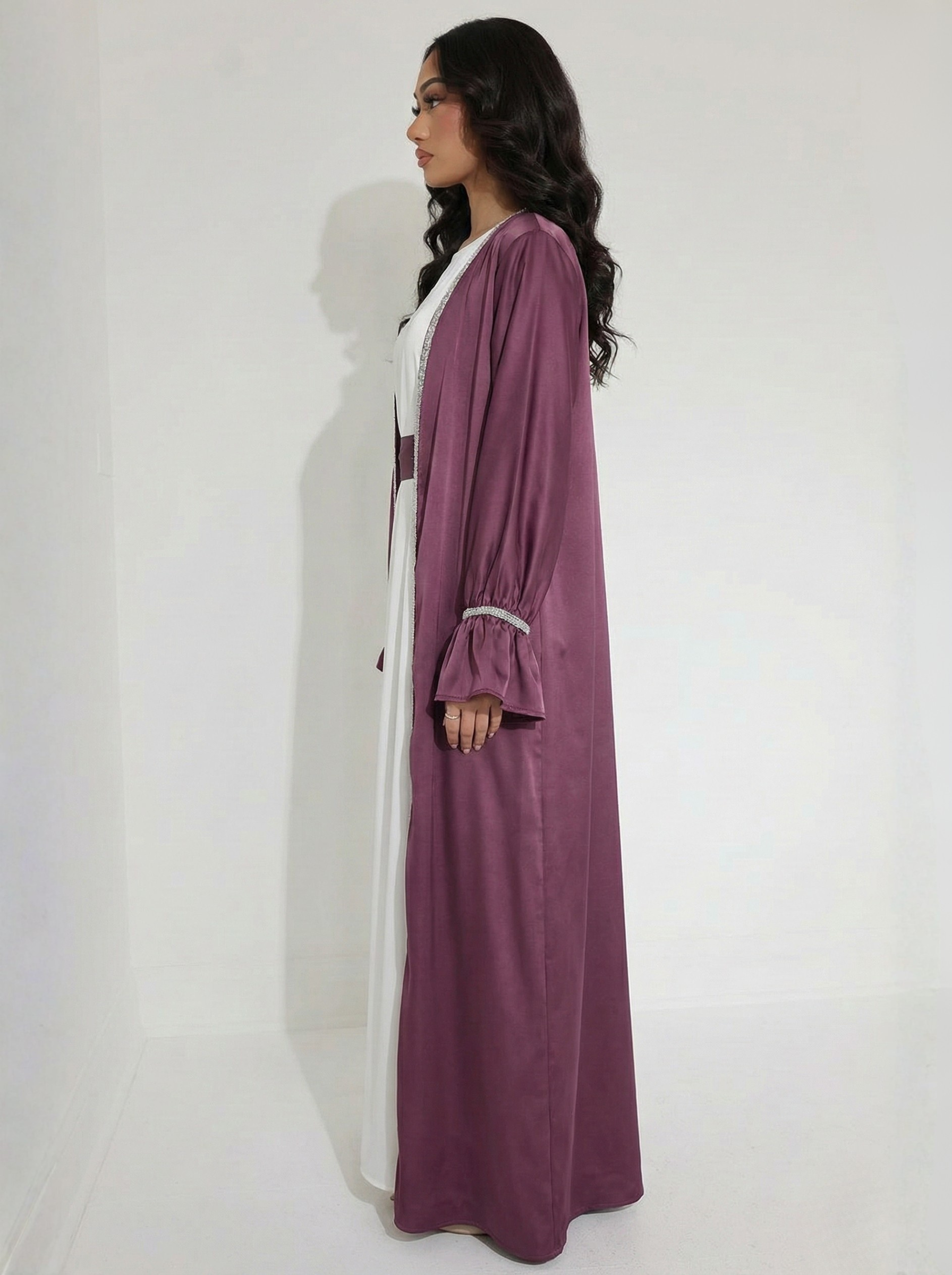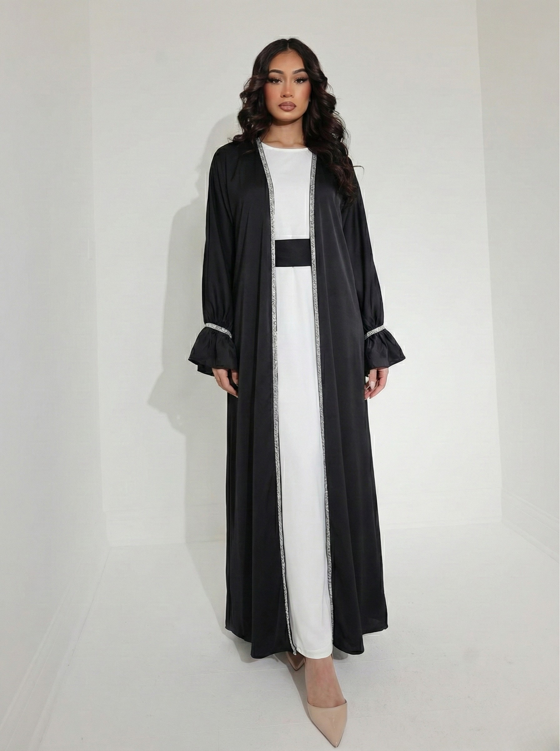 This stunning 3-piece set exudes luxury and sophistication. Crafted from premium satin, this abaya set features shimmering gem accents and a flowing silhouette, making it the perfect choice for special occasions, regal gatherings, and formal events. Its refined details and elegant design ensure you make a statement wherever you go.