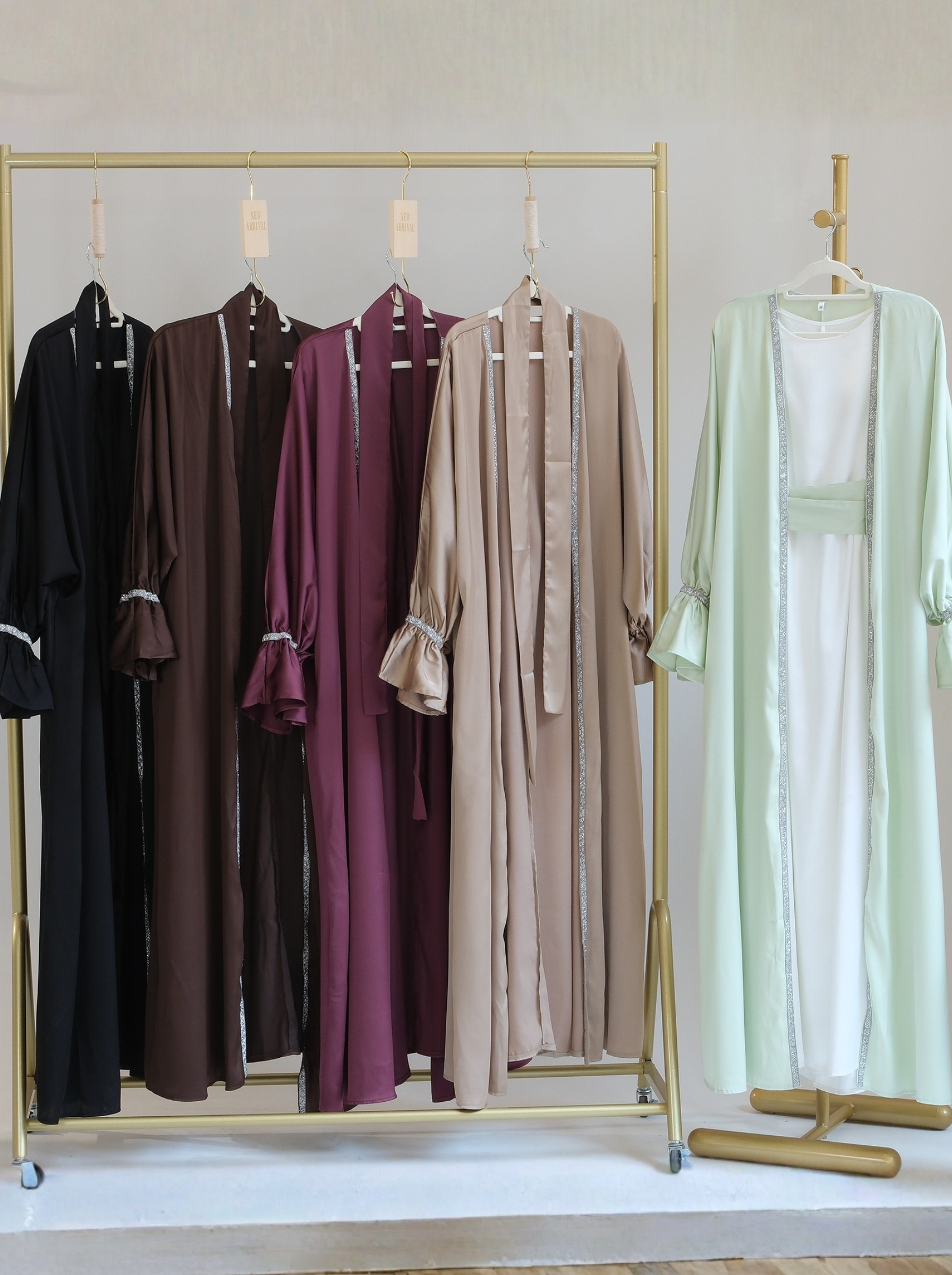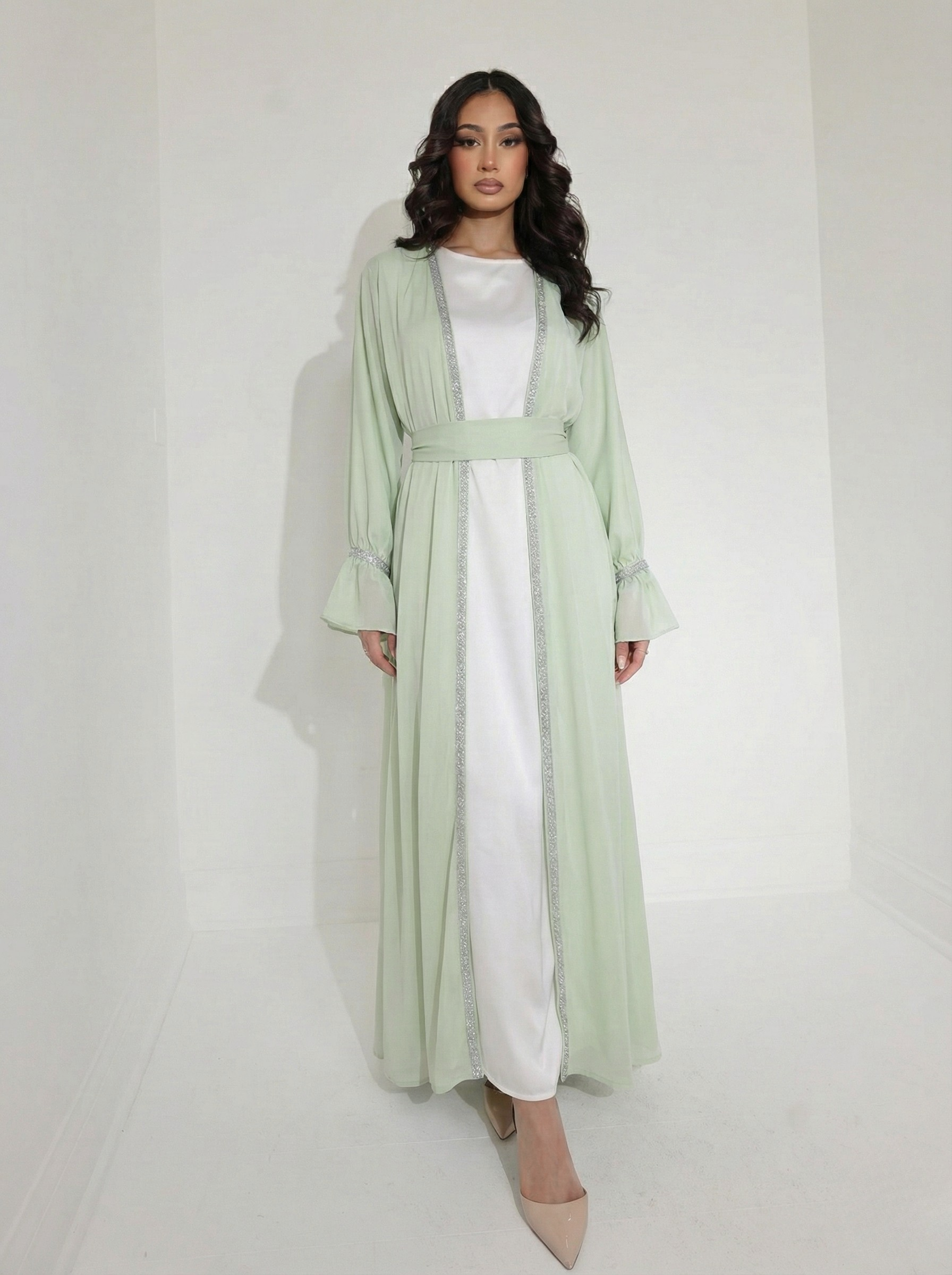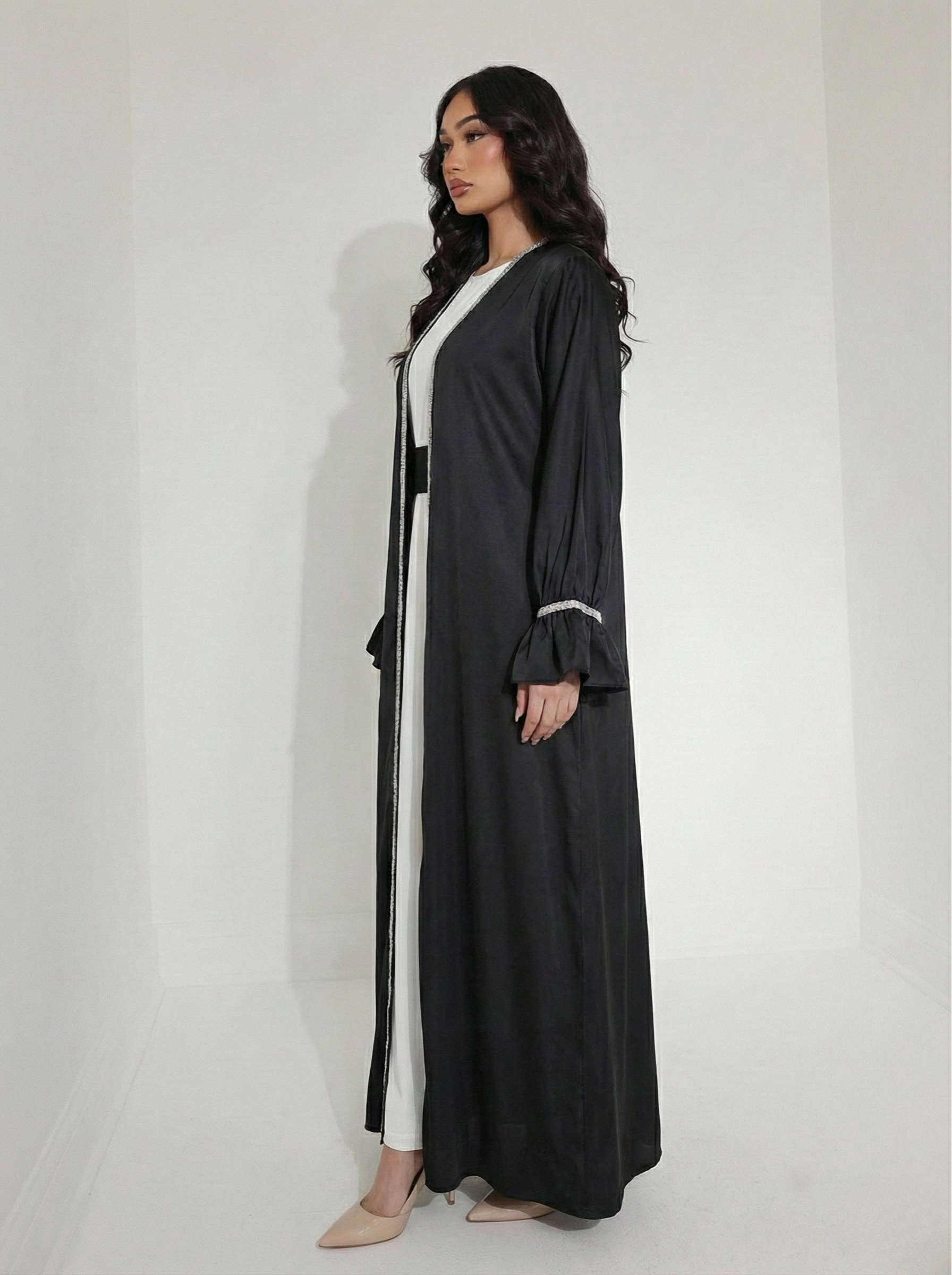 This stunning 3-piece set exudes luxury and sophistication. Crafted from premium satin, this abaya set features shimmering gem accents and a flowing silhouette, making it the perfect choice for special occasions, regal gatherings, and formal events. Its refined details and elegant design ensure you make a statement wherever you go.